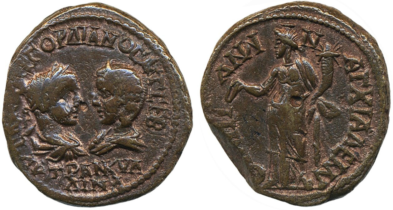 Coins, Ancient, Roman Empire. Moesia Inferior – Gordian III and Tranquillina (238–244 AD). Tetrasassarion AE 28, 11.98 g. Reverse with partially clipped planchet from production. RPC VII.2 online 1716.13. VF.