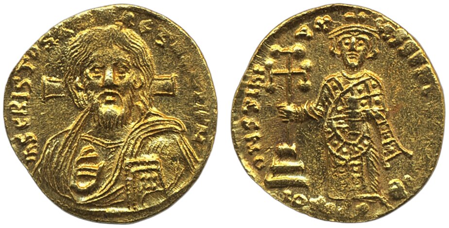 Coins, Ancient, Byzantine Empire. Justinian II (685–695, first reign). Solidus, 4.29 g. Constantinople, struck ca. 692–695. Facing bust of Christ, with long hair and full beard, wearing pallium and colobium, holding book of Gospels and raising right hand. Cross behind head / Justinian standing facing, wearing crown and loros, holding akakia and cross potent on base. Near mint state! MIB 8a, DOC 7e, S 1248. XF-UNC.
