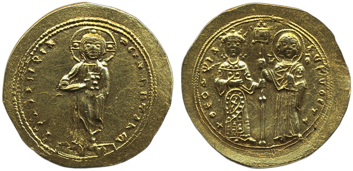 Coins, Ancient, Byzantine Empire. Theodora (1055–1056). Histamenon, 4.34 g. Constantinople. Christ standing facing on footstool / Theodora and Mary standing, holding labarum between them, pellet and triangle on labarum shaft. Faint marks and some doubling on the obverse. A bright and attractive piece. DOC III 1b, S1837. XF.
