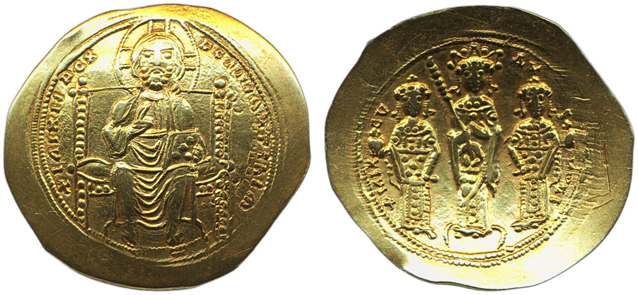 Coins, Ancient, Byzantine Empire. Eudocia (1067). Histamenon, 4.28 g. Christ enthroned, holding Gospels / Eudocia standing on footstool, flanked by Michael and Constantius. Several graffiti, otherwise nearly extremely fine. Scarce! DOC III 1, S1857. VF-XF.