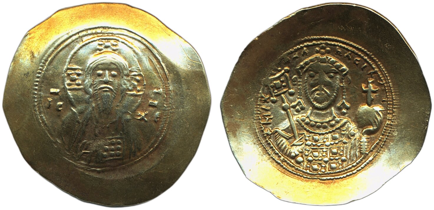 Coins, Ancient, Byzantine Empire. Michael VII Ducas (1071–1078). Histamenon. Nomisma, 4.28 g. Constantinople.N imbate bust of Christ facing / Crowned facing bust of Michael holding labarum and cross on globe. Minor scratches. DOC III 2e, S1868. VF.