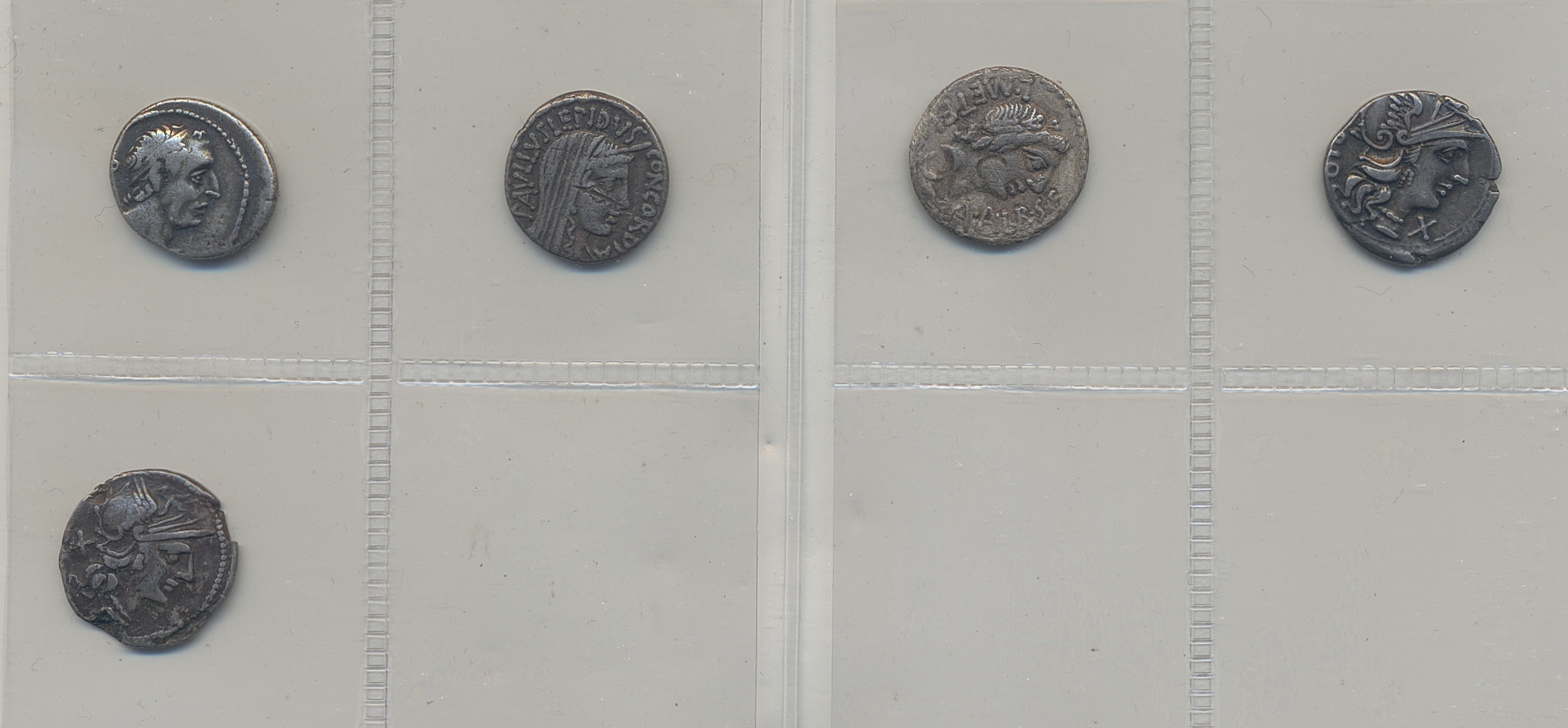 Coins, Ancient, Roman Republic. Lot. Five silver denarii. The entire lot is presented at www.philea.se. Mixed quality.