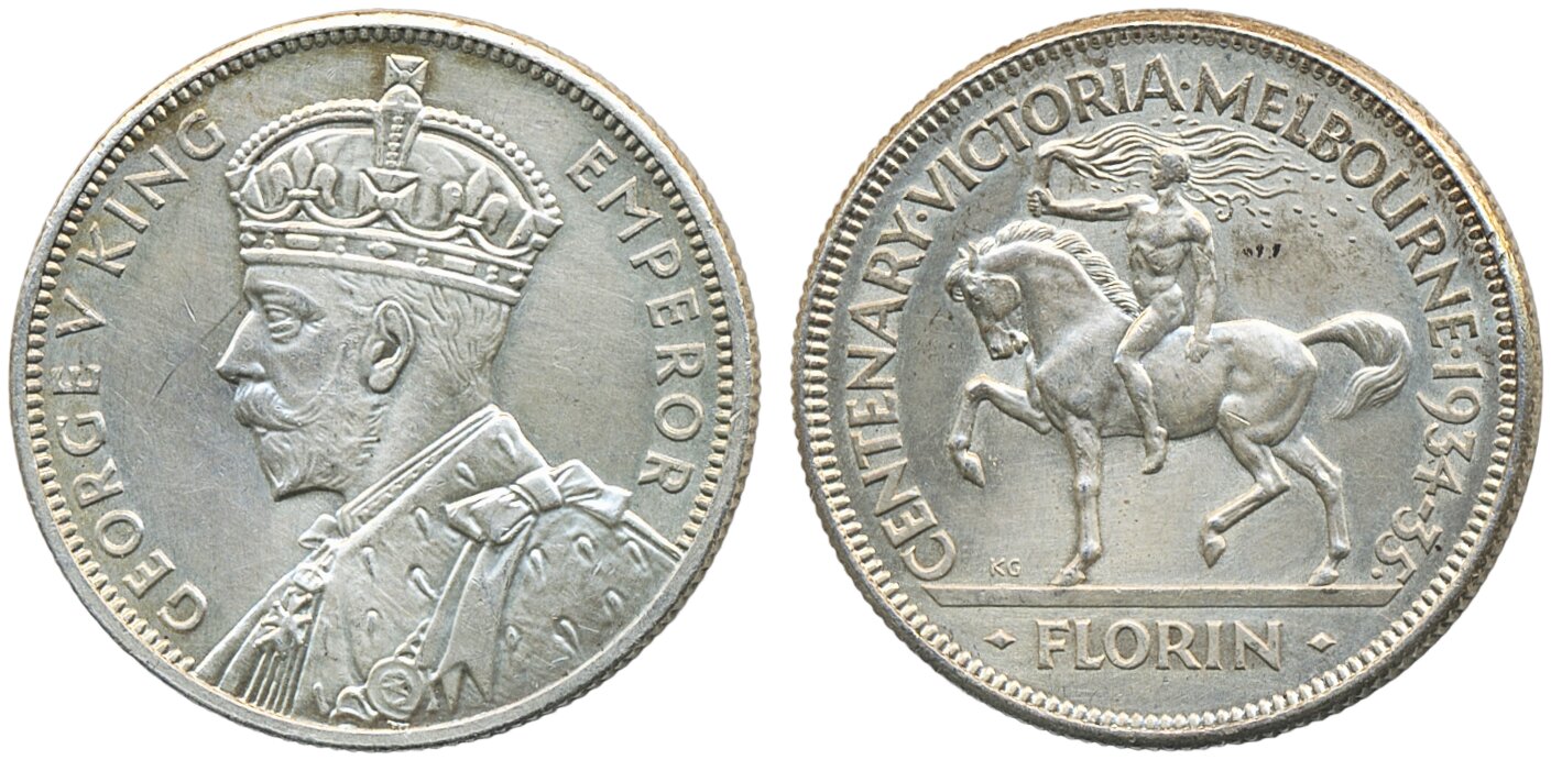 Coins, Australia. KM 33, 1 florin 1934. Melbourne commemorative issue. Lightly cleaned. XF.