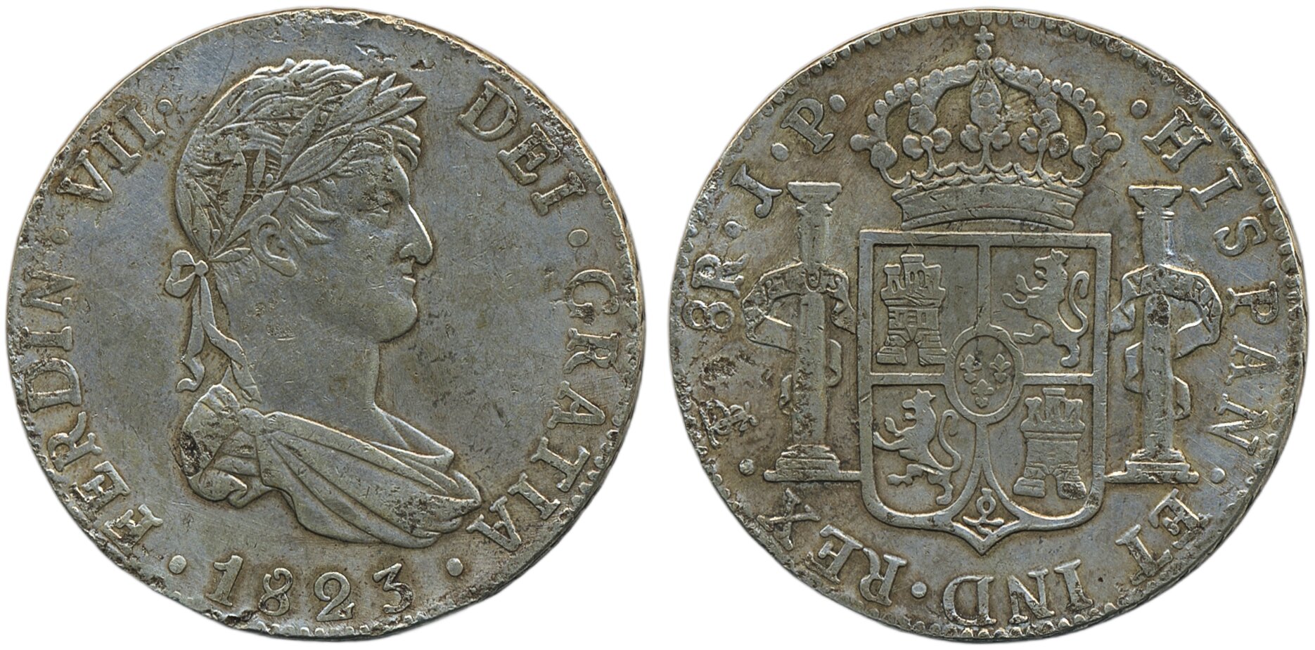 Coins, Bolivia. Ferdinand VII (1808-1825), KM 84, 8 reales 1823. 25.61 g. Potosi. Calico 539. VF.