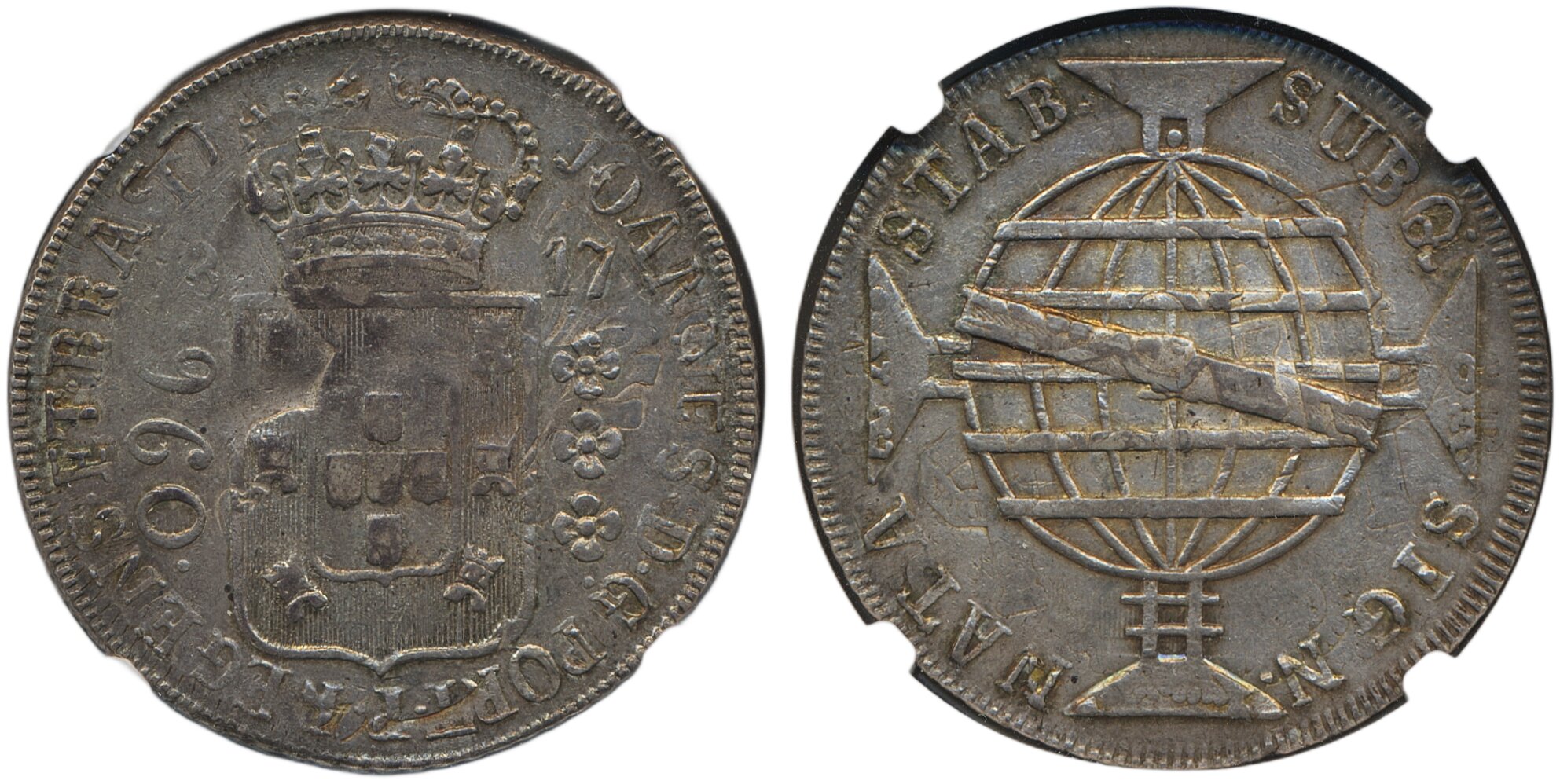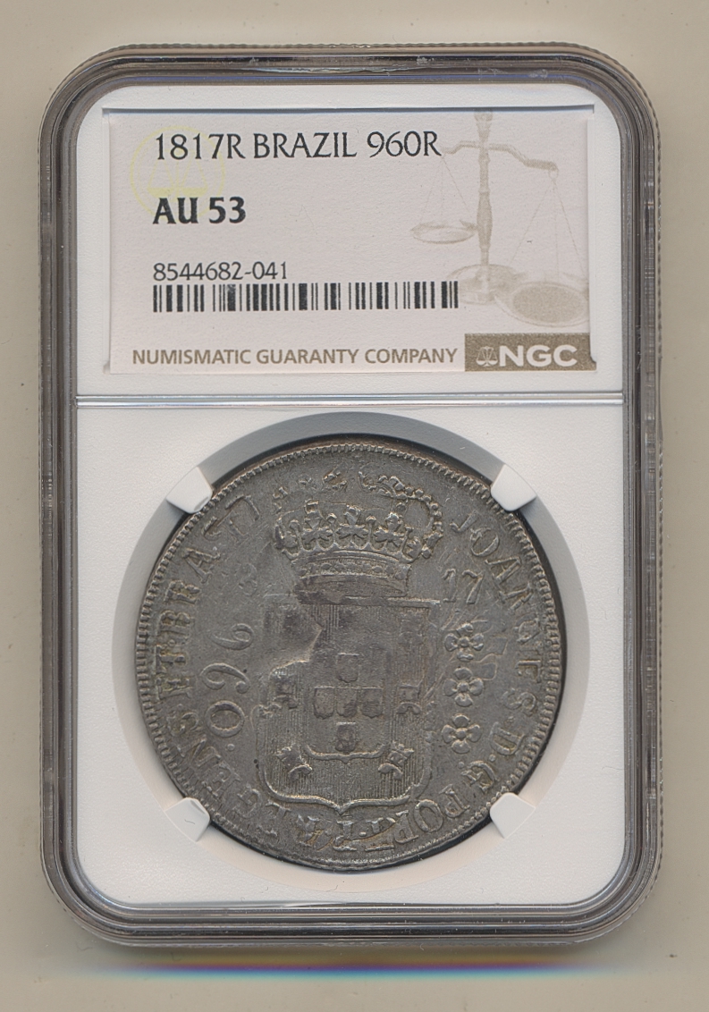 Coins, Brazil. Joao VI (1799-1818), KM 307.3, 960 reis 1817. Rio De Janeiro mint. Graded by NGC as AU53. Attractively toned example with some lustre. XF. See certification at NGC
