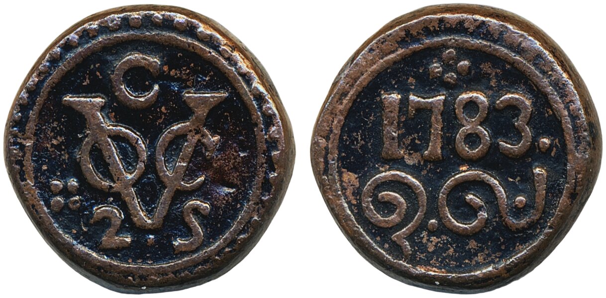 Coins, Ceylon. KM 30, 2 stuivers 1783. 14.41 g. Light corrosion, but good for type. VF-XF.