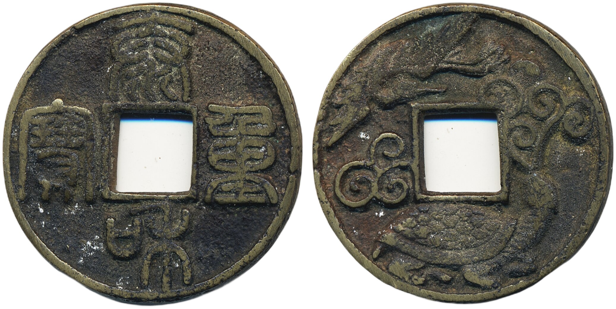 Medals, regal, China, Ancient. 25.50 g. 43 mm. Qing dynasty charm in style of cash coin with reverse showing phoenix and tortoise. VF.