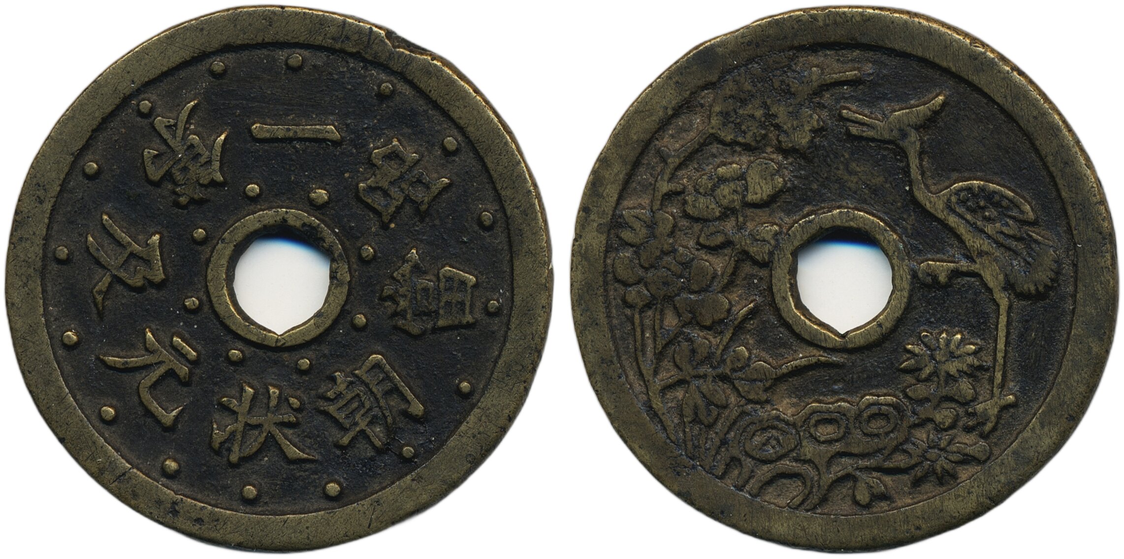 Medals, regal, China, Ancient. Qing Dynasty, CCH- 812 var, Brass charm, 46 mm, 26.05 g. Obverse with inscription "[May you be] an official of the first degree at the imperial court and first rank at the examination for the Hanlin Academy". Reverse: Stork, bird and flowers. Minor casting flaw at edge, else good condition. VF-XF.