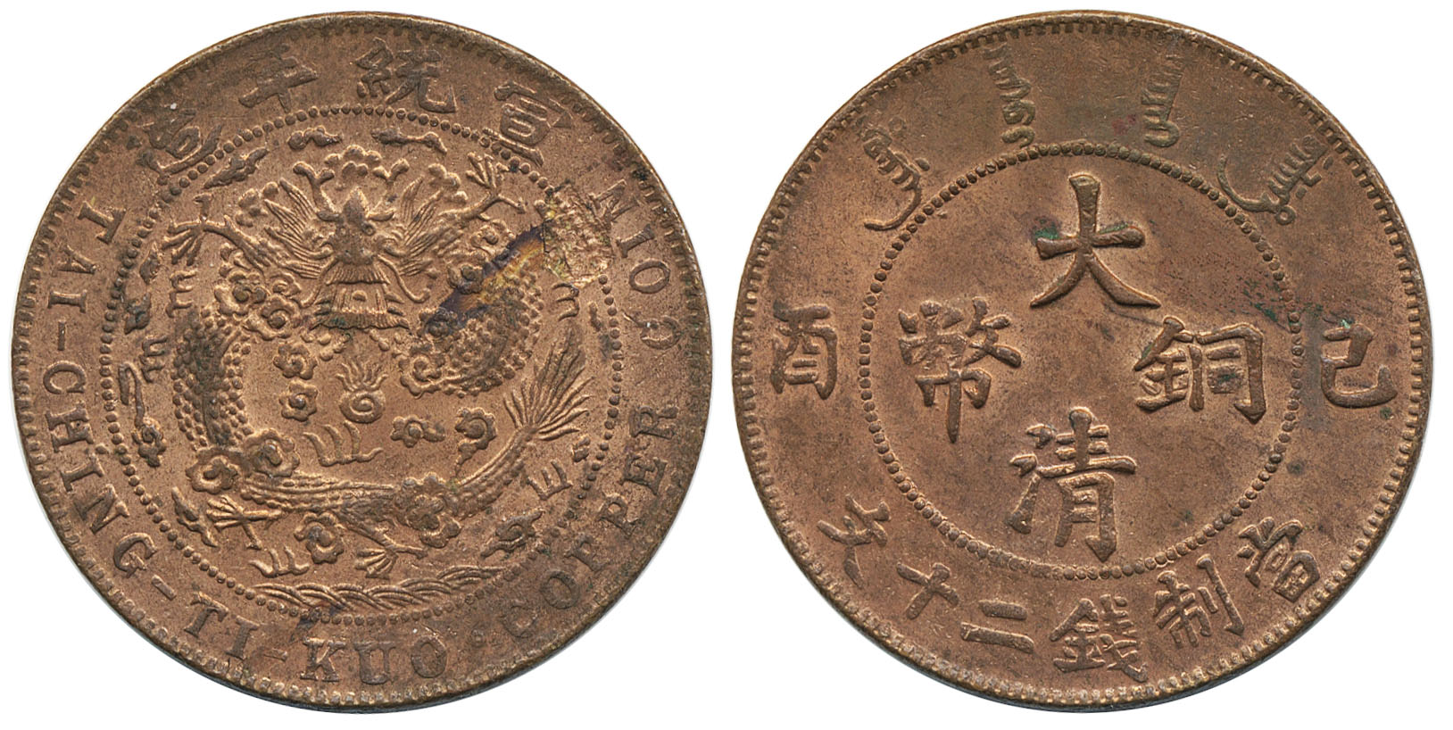 Coins, China, Empire. KM Y-21, 20 cash ND (1909). Lustrous example with minor planchet flaw. CL-HB.63. Ex. Swedish Missionary family stationed in China 1897–1945. XF-UNC.