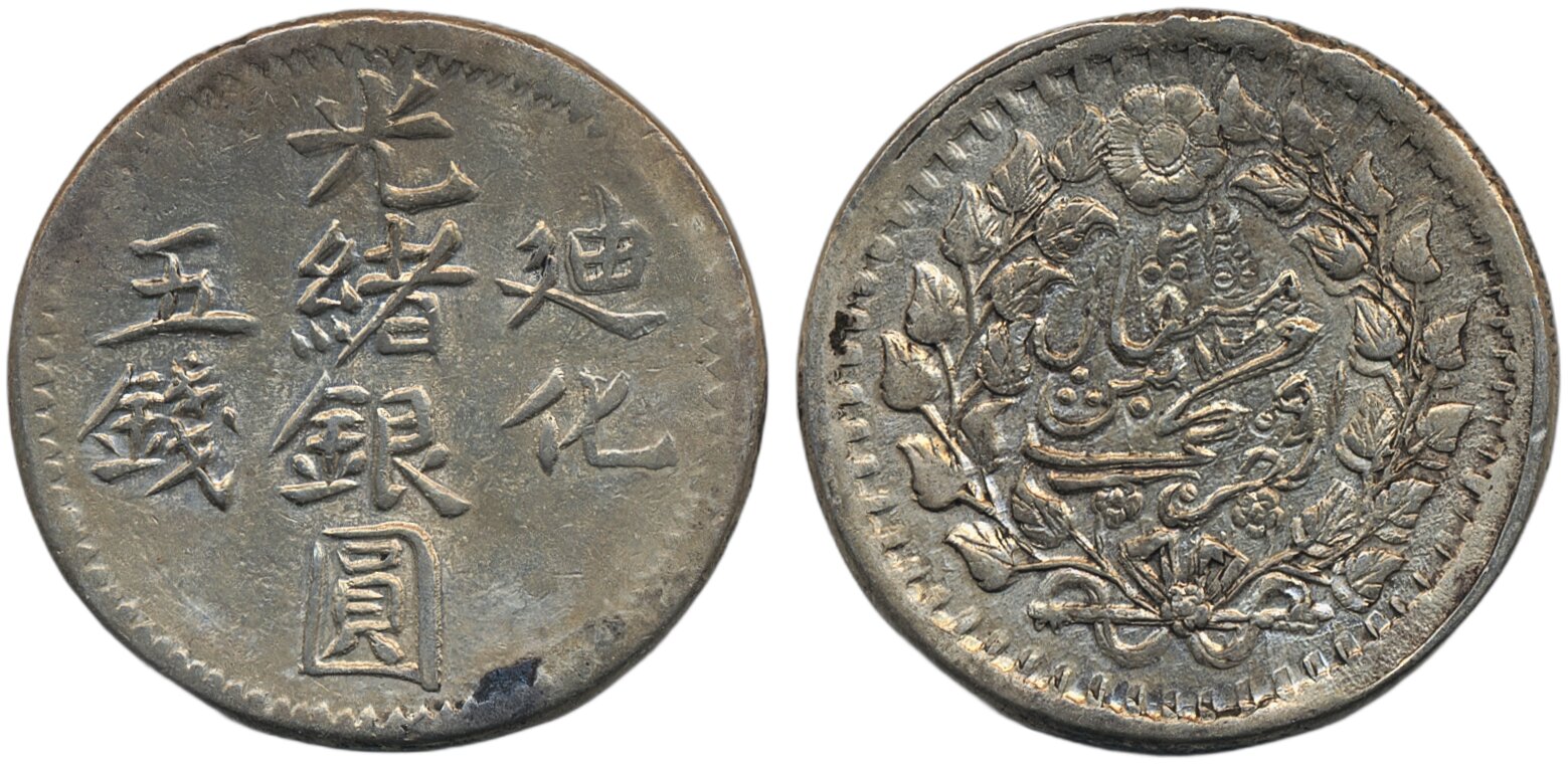 Coins, China, Sinkiang province. L&M- 793, 5 mace AH1322 (1904). 16.98 g. Tihwa mint. Lustrous example. XF.