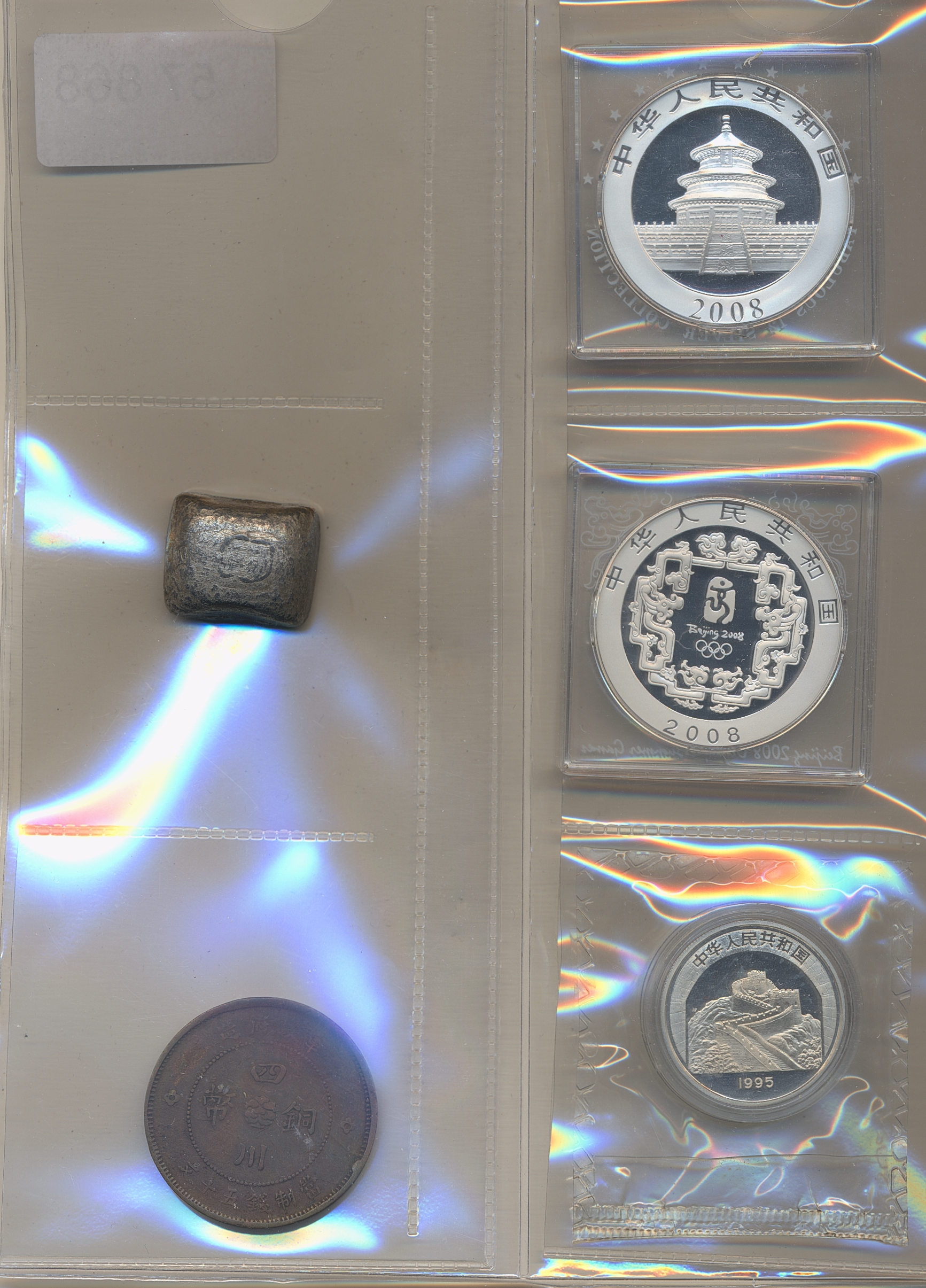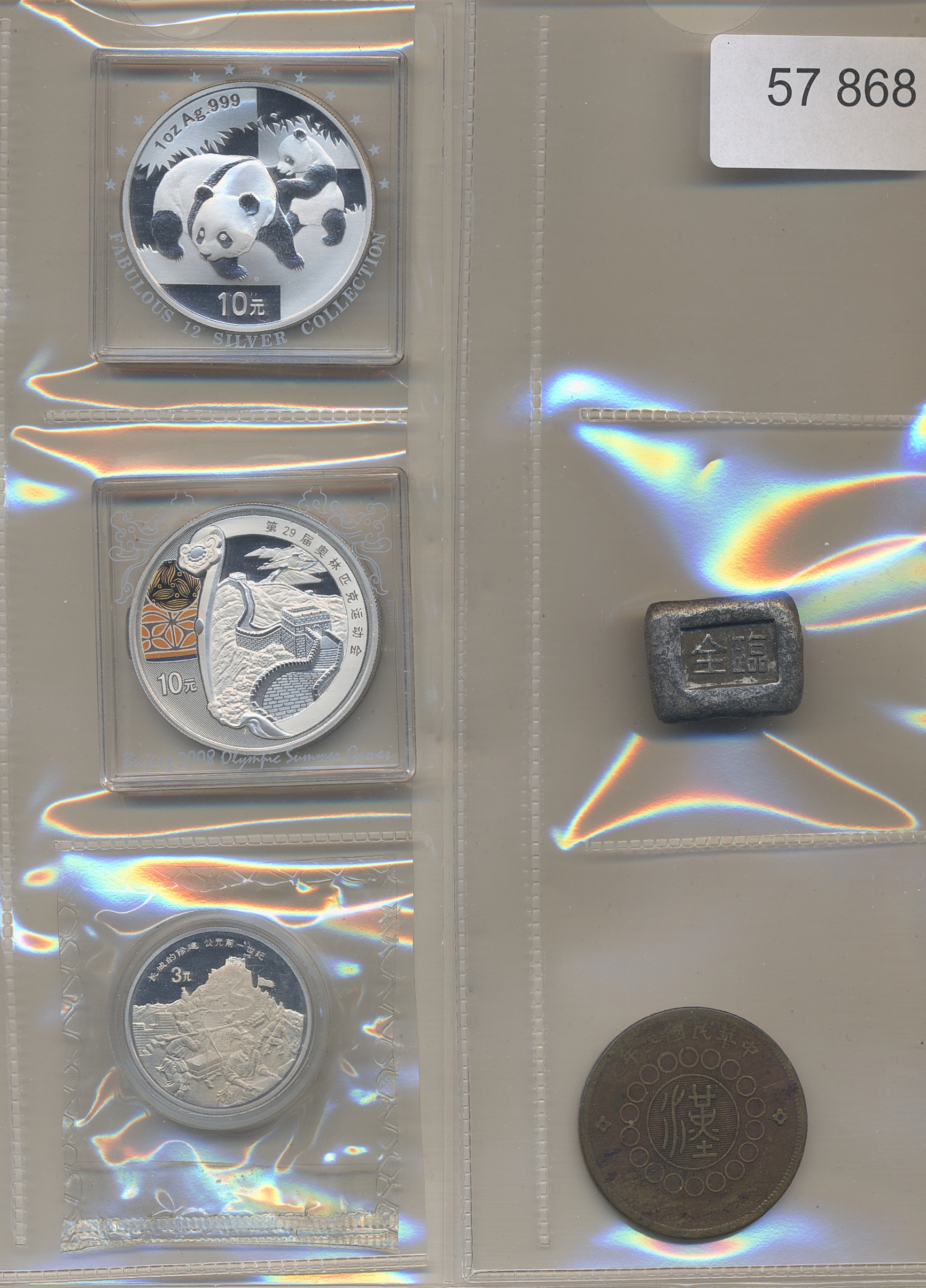 Coins, China, mixed. Small group of five Chinese coins including two modern 1 oz silver coins and a counterfeit 1 tael sycee. Please inspect! F-UNC.