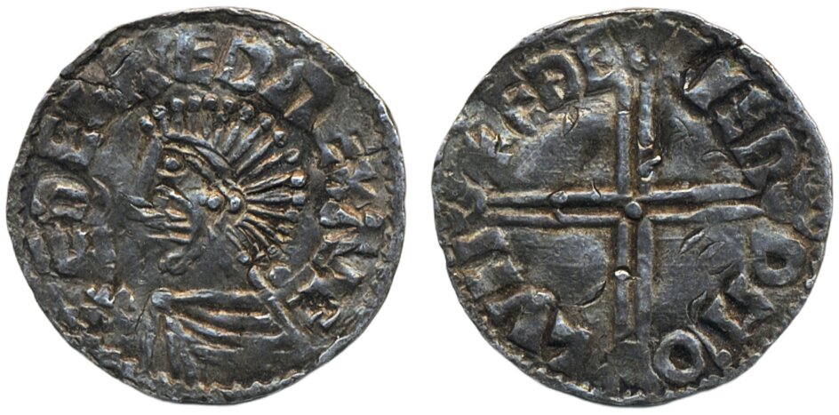 Coins, Great Britain. Æthelred II, Spink 1151, 1 penny ND. 1.33 g. London mint. Long cross type. Peck marks, small planchet crack. F-VF.