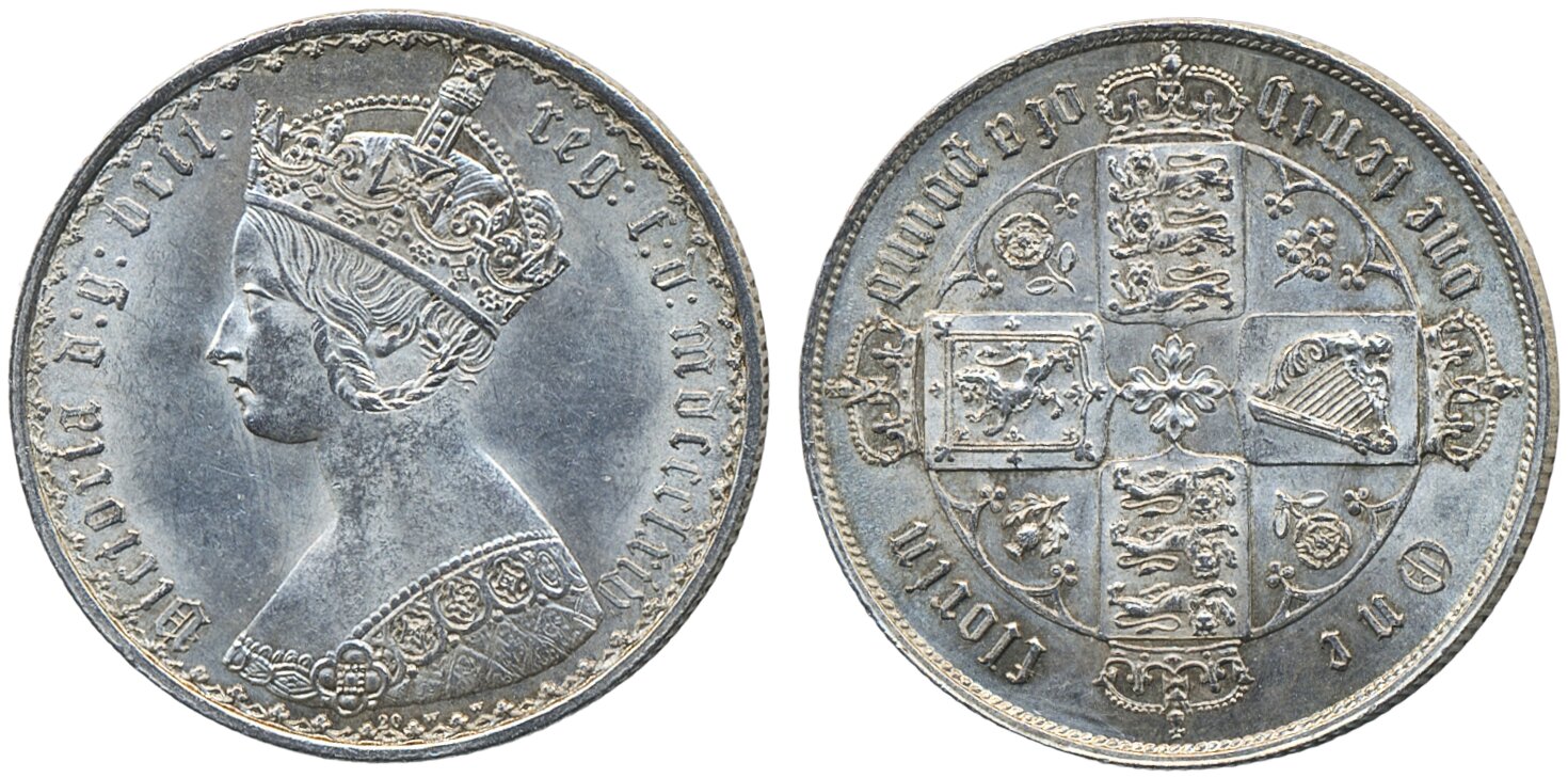 Coins, Great Britain. Victoria, Spink 3892, 1 florin 1864. Lustrous example. XF.