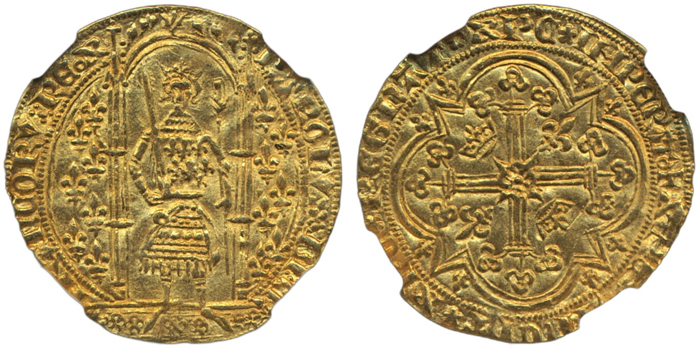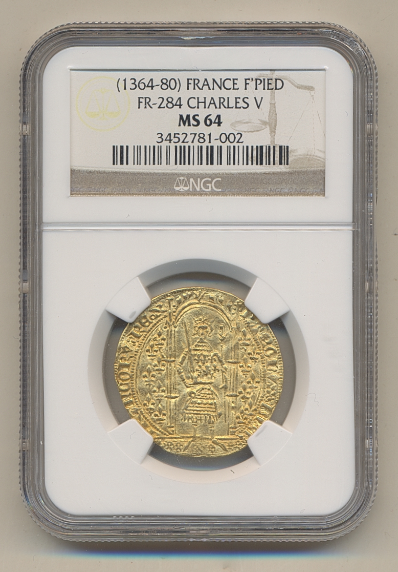 Coins, France. Charles V (1364-1380), Dup. 360, 1 franc a pied ND (1364–80). Graded by NGC as MS64. Fr-284. XF-UNC. See certification at NGC