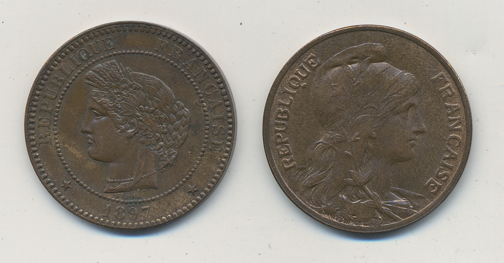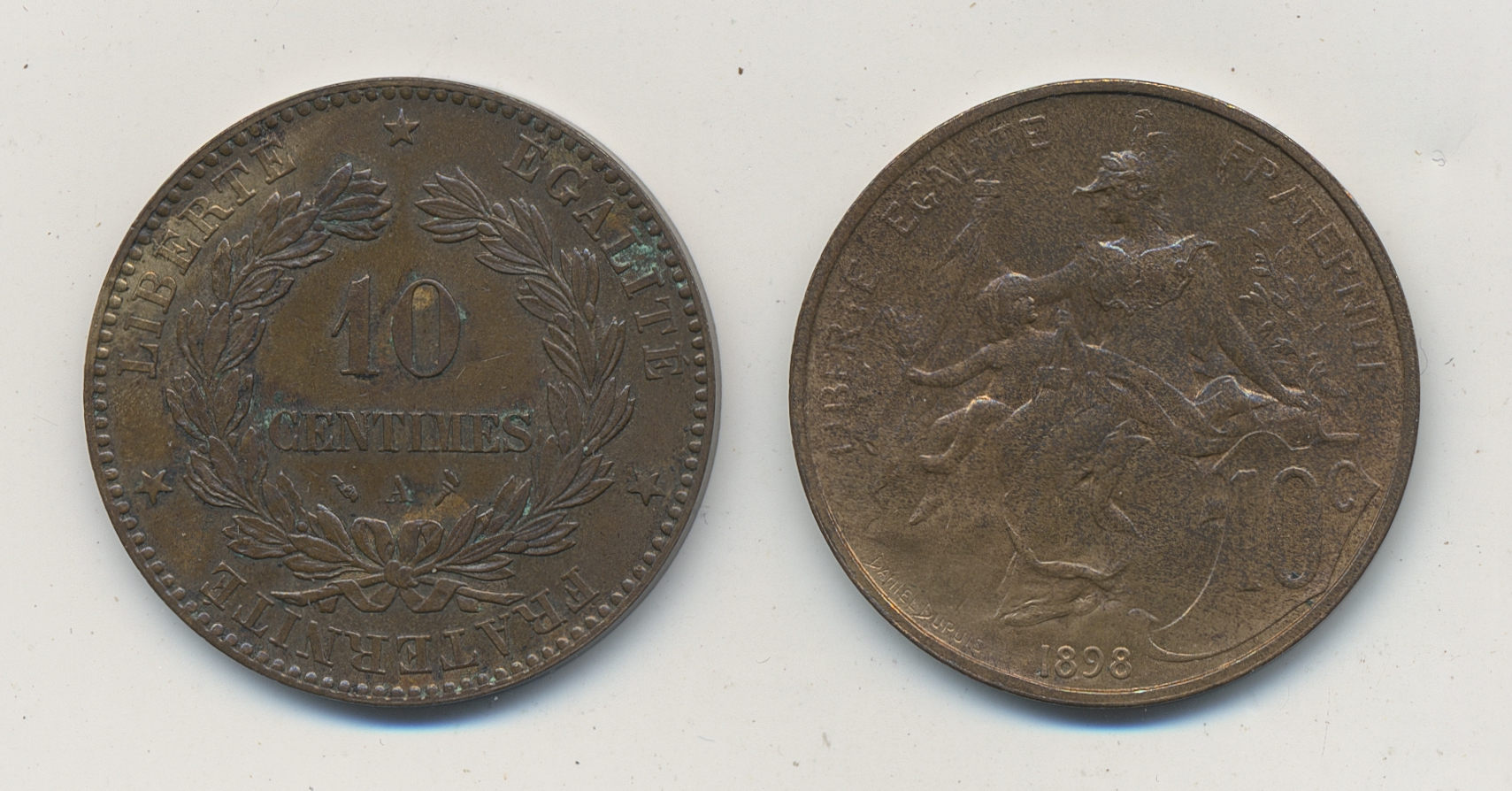 Coins, France. Third Republic, KM 815.1, 843, 10 centimes. 1897 (minor verdigris) and 1898. XF.