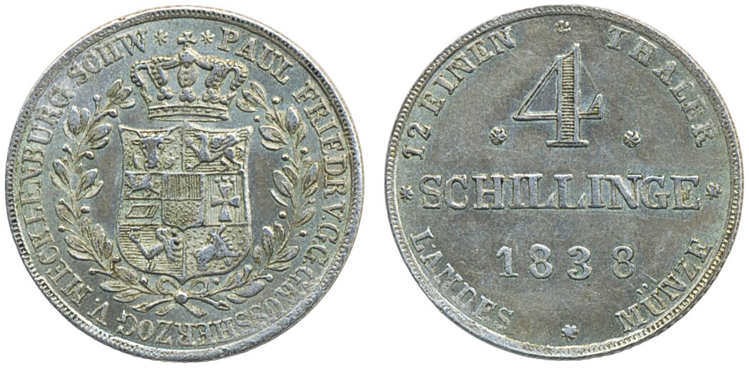 Coins, Germany, Mecklenburg-Schwerin. Paul Friedrich (1837-1842), KM 237, 4 schilling 1838. Lustrous example. Jaeger 44. XF.