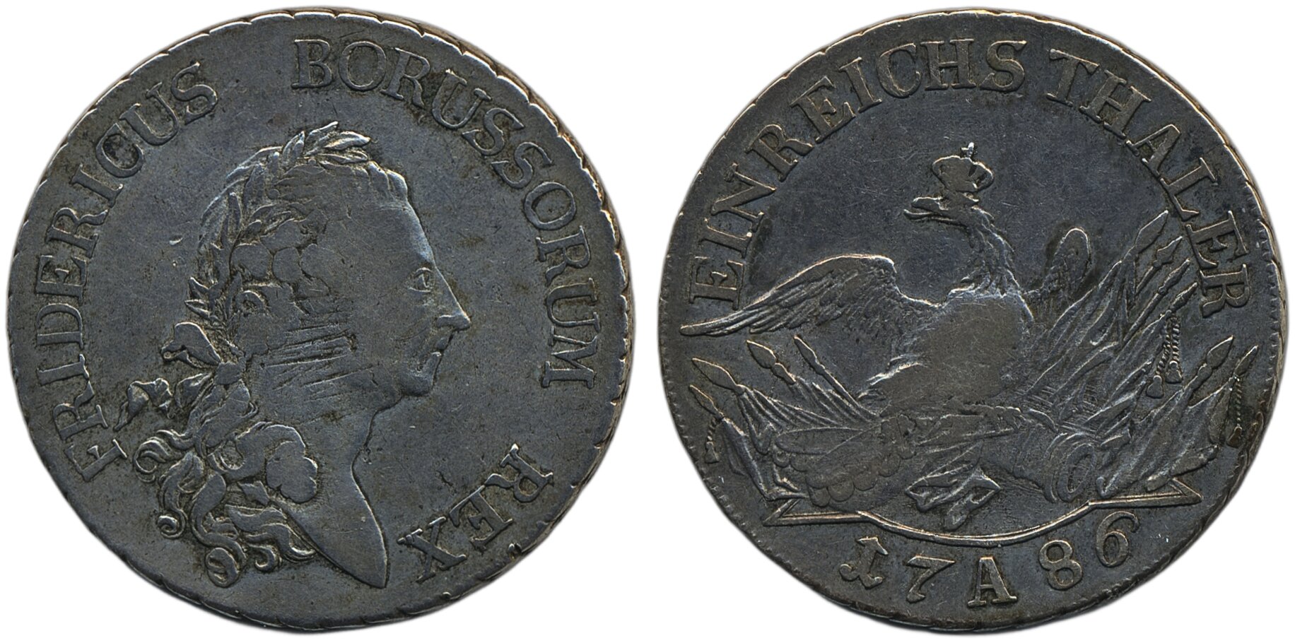 Coins, Germany, Prussia. Friedrich II (1740-1786), KM 332.1, 1 taler 1786 A. 21.82 g. Berlin mint. Adjustment marks, somewhat cleaned. Dav. 2590A. VF.