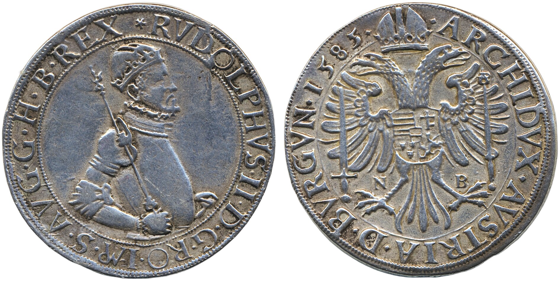 Coins, Hungary. Rudolph II (1572-1608), Dav. 8067, 1 taler 1585 NB. 23.51 g. Nagybanya mint. Lightly cleaned. VF.