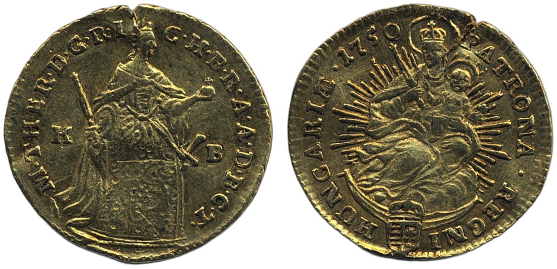 Coins, Hungary. Maria Theresia (1740-1780), KM 329.2, 1 ducat 1750. 3.43 g. Kremnitz mint. Has been mounted. Friedberg 180. F-VF.