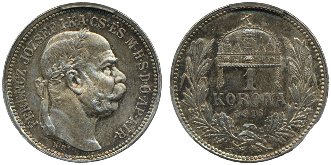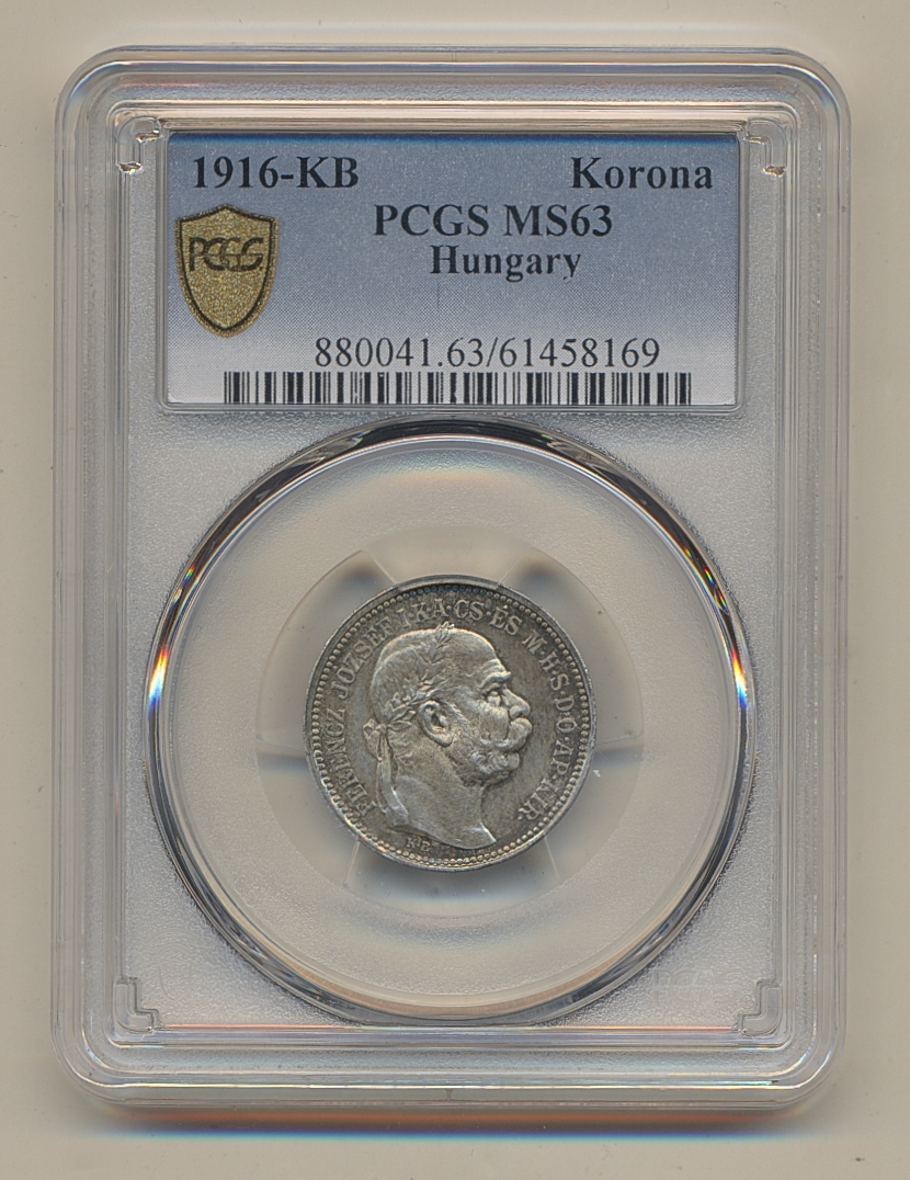 Coins, Hungary. Franz Joseph (1848-1916), KM 469, 1 korona 1916. Graded by PCGS as MS63. XF-UNC. See certification at PCGS