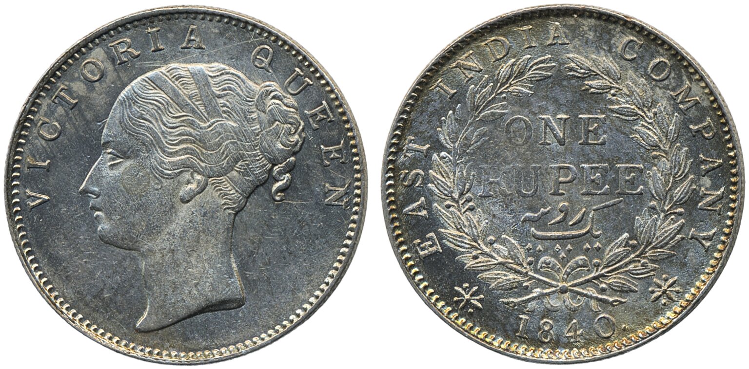 Coins, India. Queen Victoria (1837-1901), KM 455, 1 rupee 1840. Lustrous example, some adjustment marks. Continuous legend. XF-UNC.