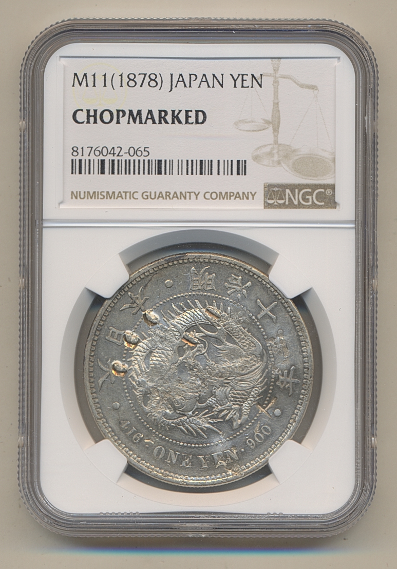 Coins, Japan. KM Y-A25.2, 1 yen 1878 (Meiji 11). Chopmarked. Scarce date. Graded by NGC. F-VF. See certification at NGC