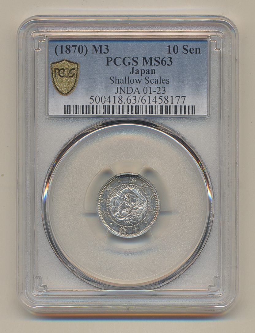 Coins, Japan. Mutsuhito (1867-1912), JNDA 01-23, 10 sen 1870 (Meiji 3). Graded by PCGS as MS63. XF-UNC. See certification at PCGS
