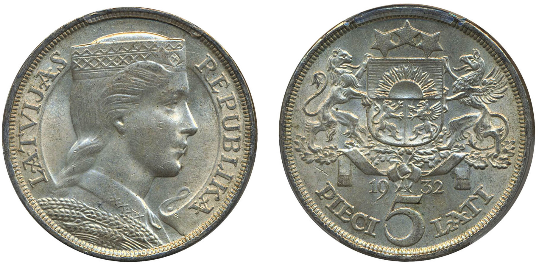 Coins, Latvia. KM 9, 5 lati 1932. Graded by PCGS as MS63. XF-UNC. See certification at PCGS