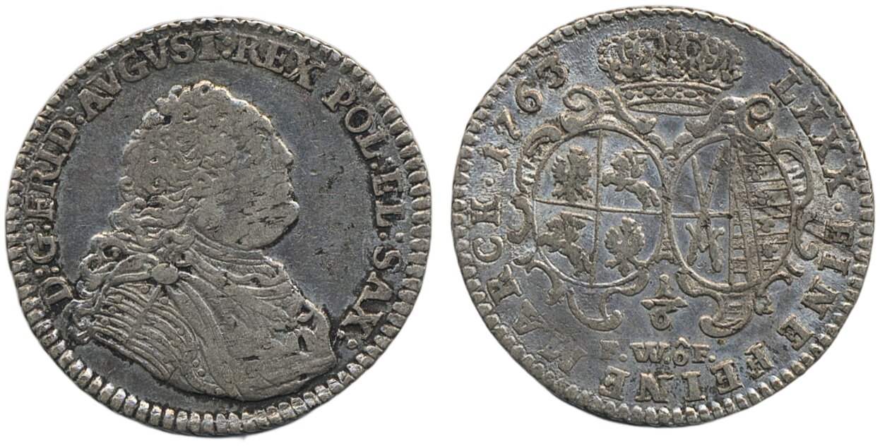 Coins, Poland, Saxony. Friedrich August II (1733-63), Kop. 11355 (R), 1/6 taler 1763. 5.27 g. Dresden. Lustrous example, somewhat weakly struck. Kahnt 565. VF-XF.