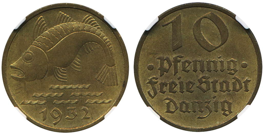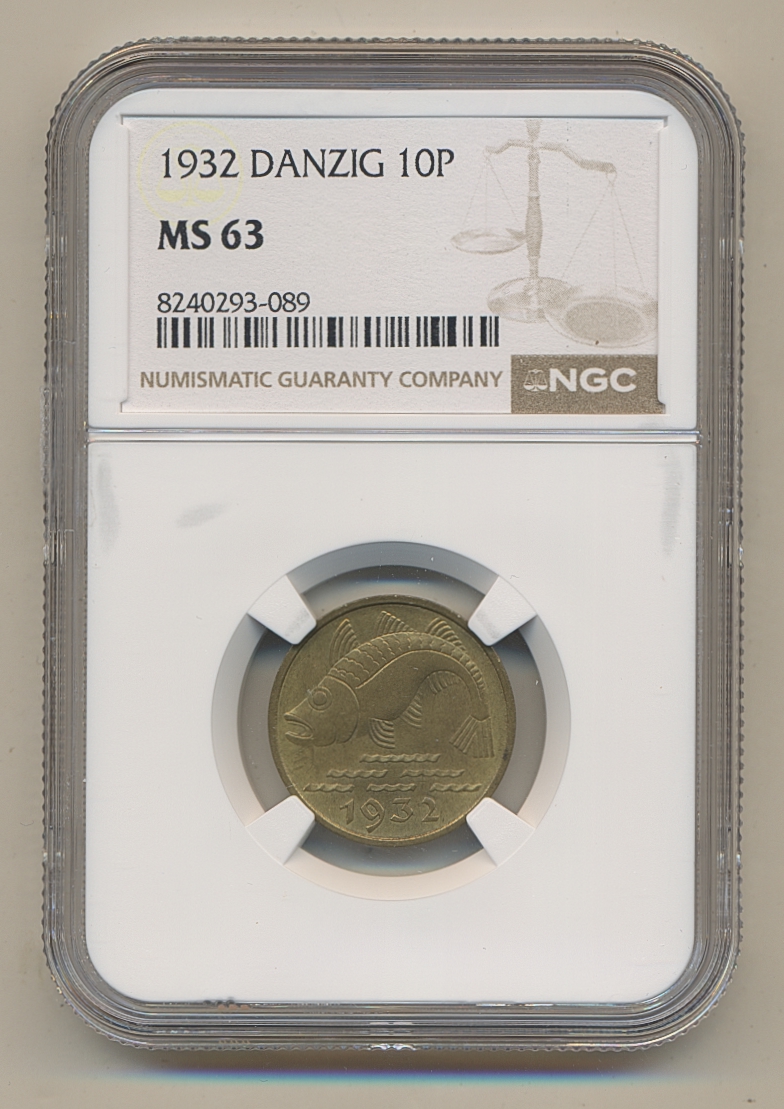 Coins, Poland, Danzig. KM 152, 10 pfennig 1932. Graded by NGC as MS63. XF-UNC. See certification at NGC