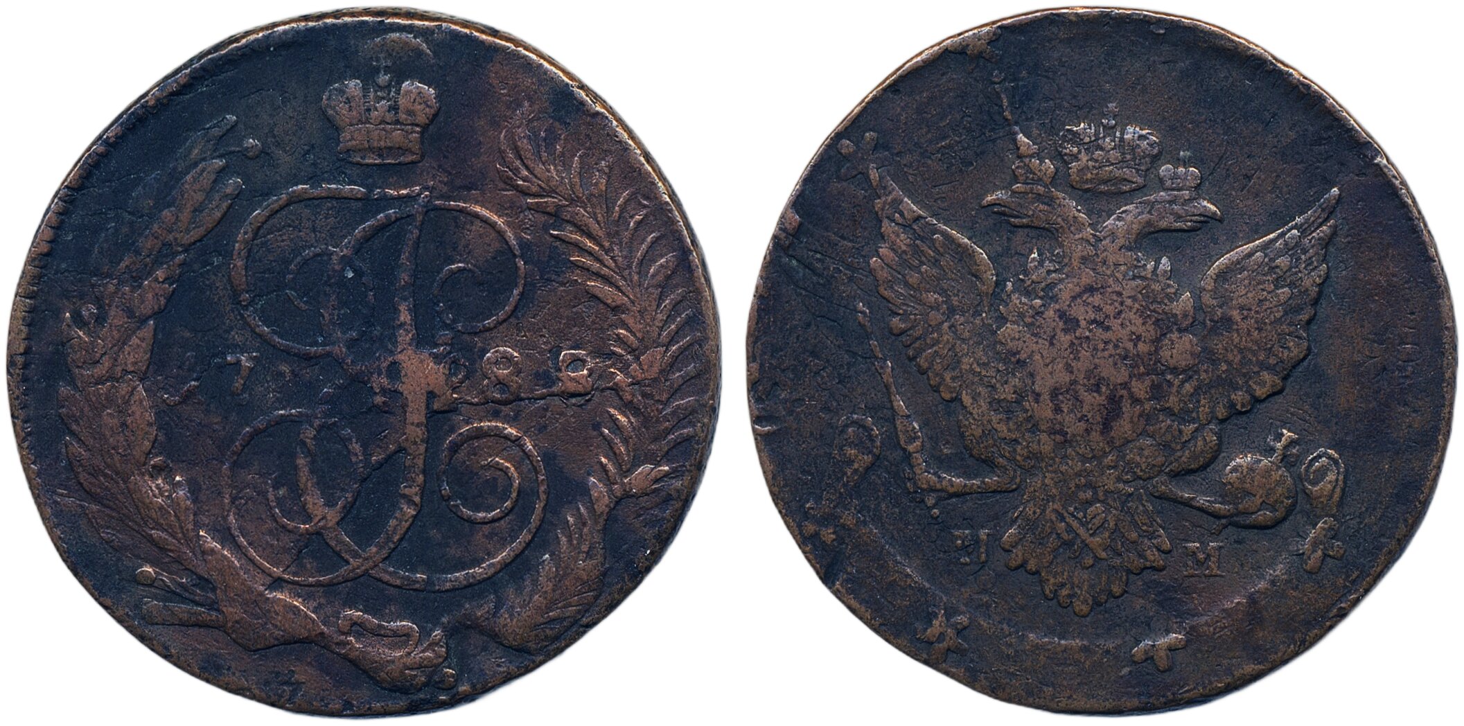 Coins, Russia. Catherine II, Bitkin 528, 5 kopeks 1788 MM. 53.60 g. Moscow mint. Overstruck on 10 kopeks 1762 with clear remnants of original design on obverse. Cleaned. F.