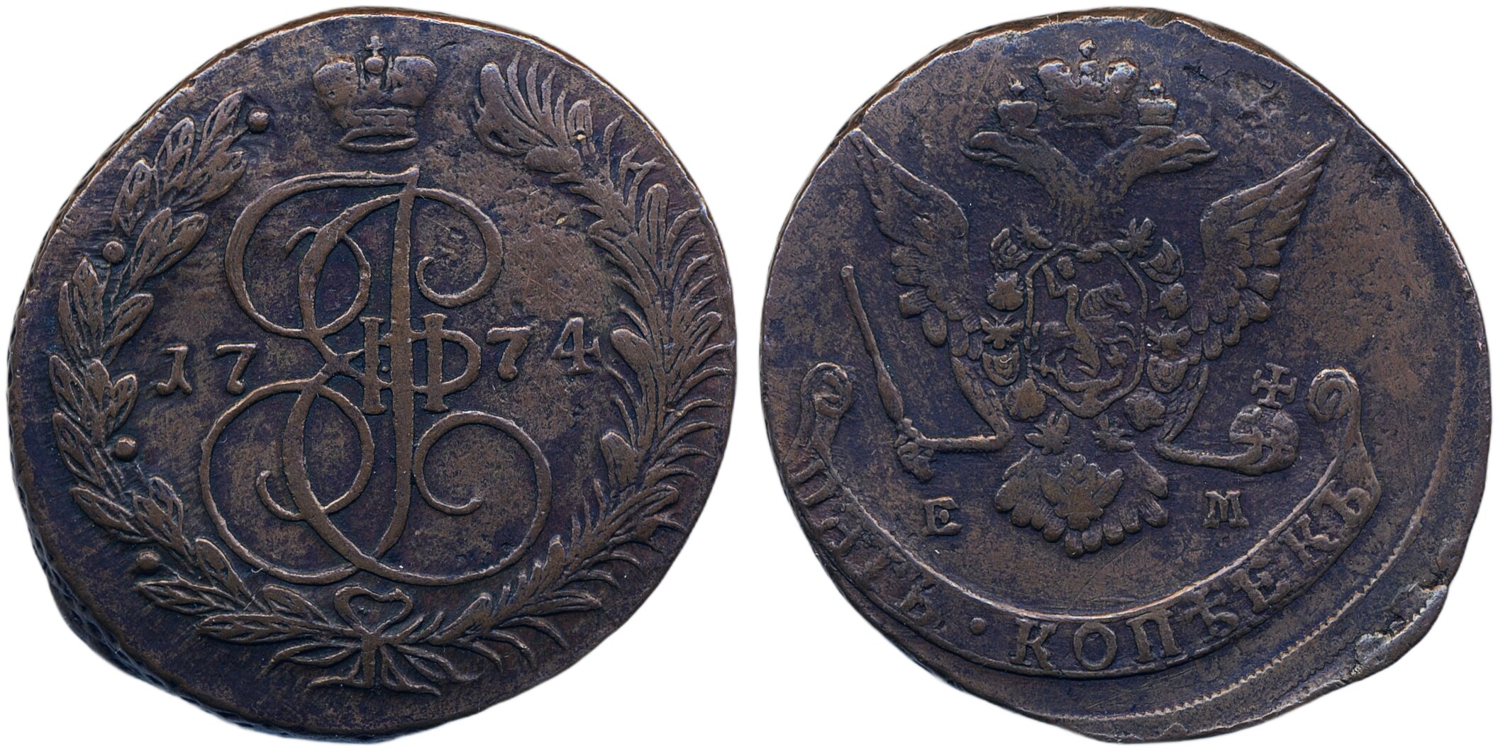 Coins, Russia. Catherine II, Bitkin 623a, 5 kopeks 1774 EM. 53.83 g. Ekaterinburg mint. VF-XF.