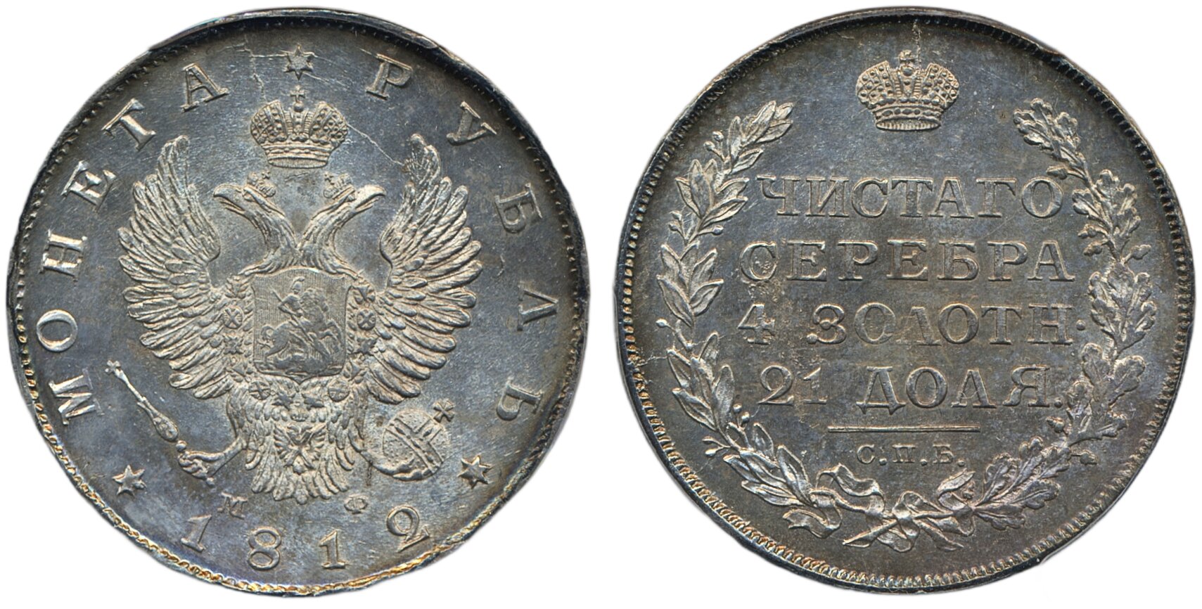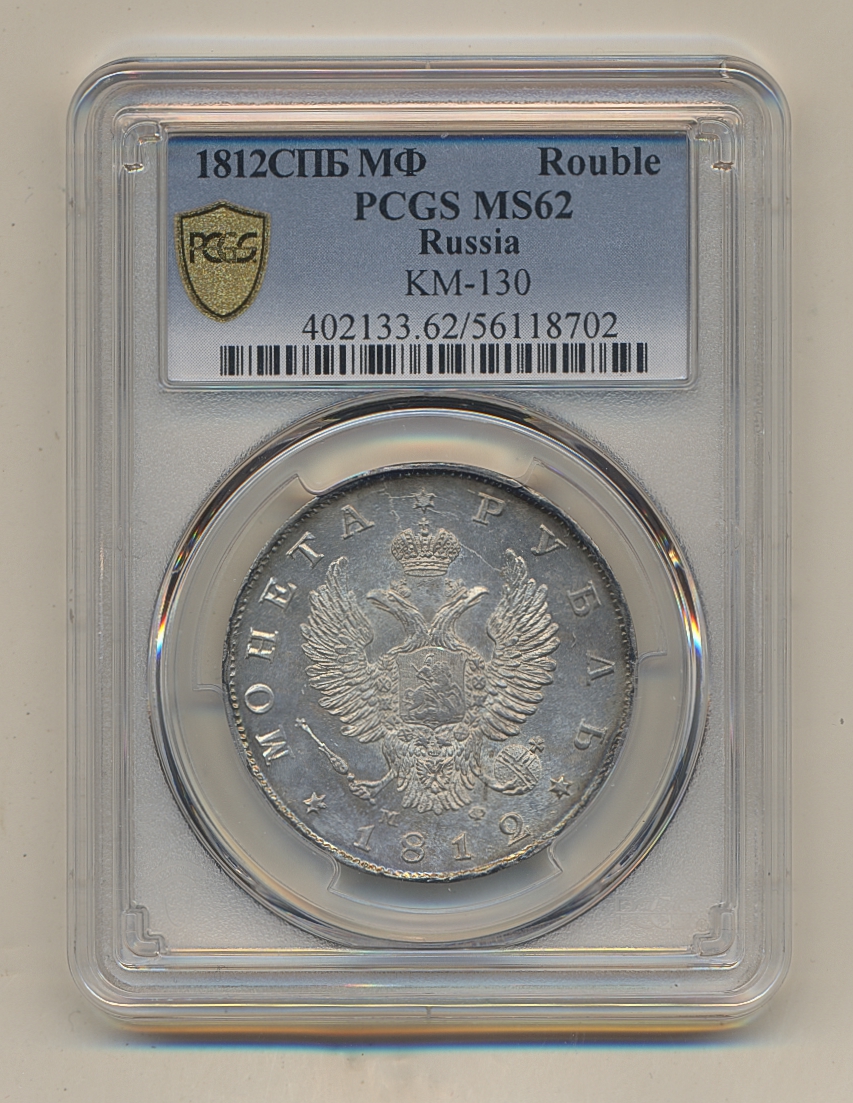 Coins, Russia. Alexander I, Bitkin 103, 1 rouble 1812. Graded by PCGS as MS62. In our opinion conservatively graded. XF-UNC. See certification at PCGS