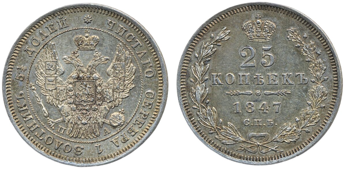 Coins, Russia. Nicholas I, Bitkin 294, 25 kopeks 1847. XF.