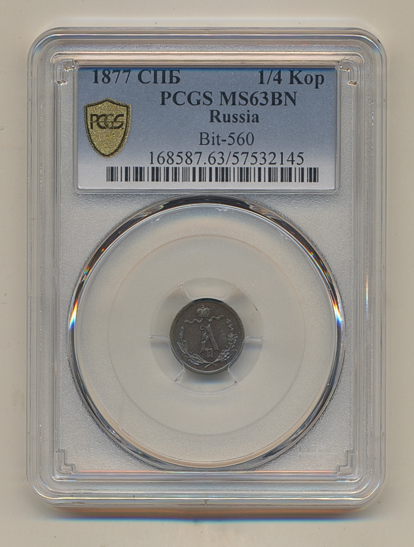Coins, Russia. Alexander II, Bitkin 560, ¼ kopek 1877. Graded by PCGS as MS63 BN. XF-UNC. See certification at PCGS