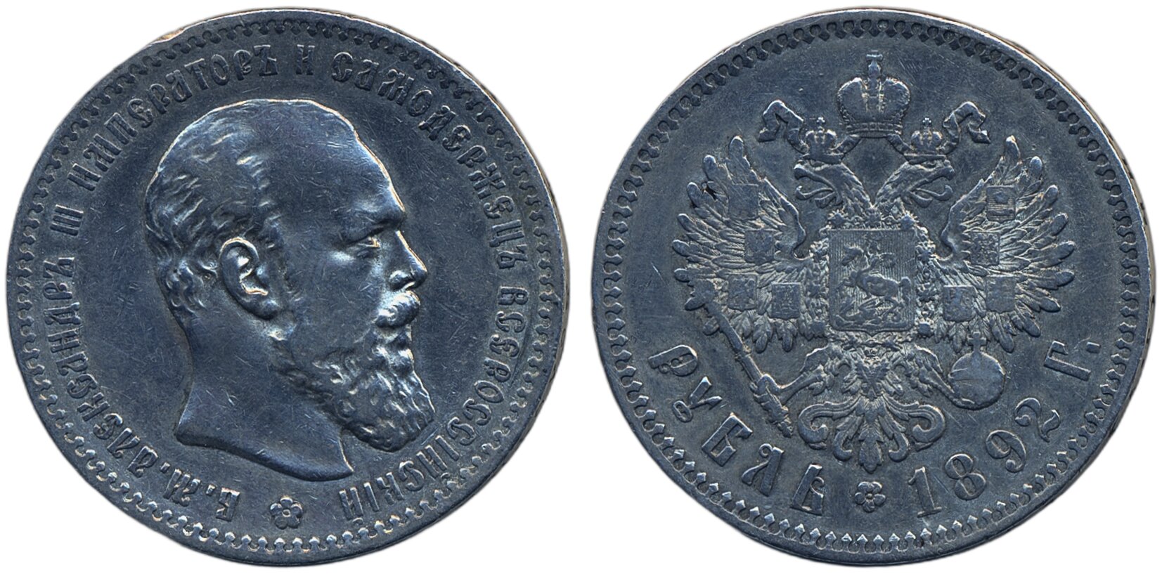 Coins, Russia. Alexander III, Bitkin 76, 1 rouble 1892. Cleaned, small rim nick. VF.