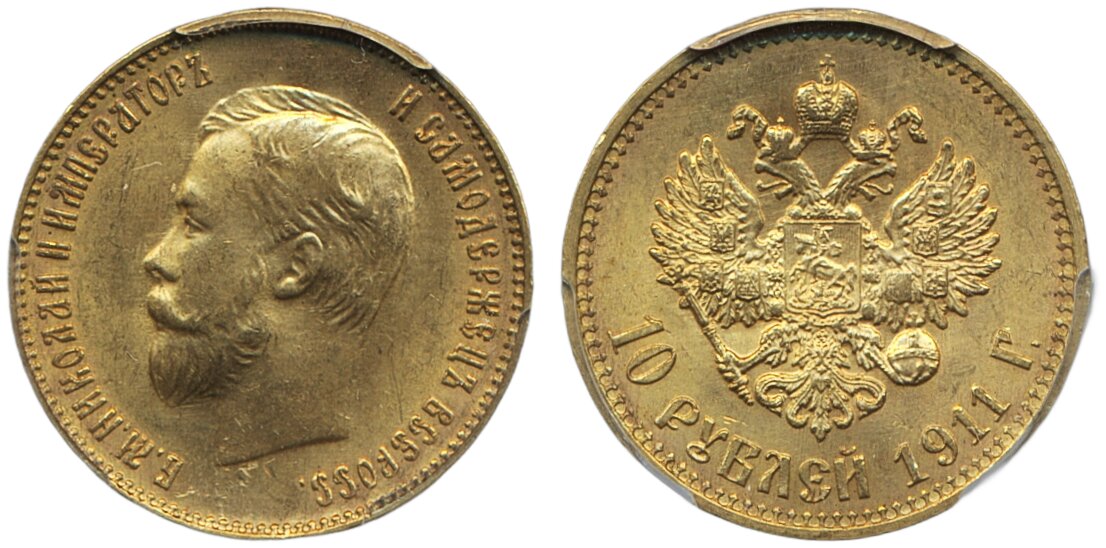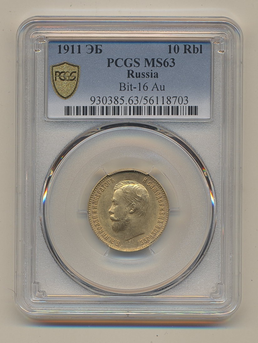 Coins, Russia. Nicholas II, Bitkin 16, 10 roubles 1911. Graded by PCGS as MS63. XF-UNC. See certification at PCGS