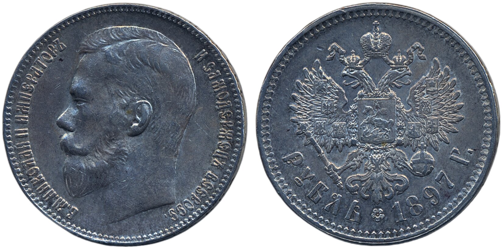 Coins, Russia. Nicholas II, Bitkin 203, 1 rouble 1897. Brussels mint (** on rim). Minor scuff on reverse. VF.