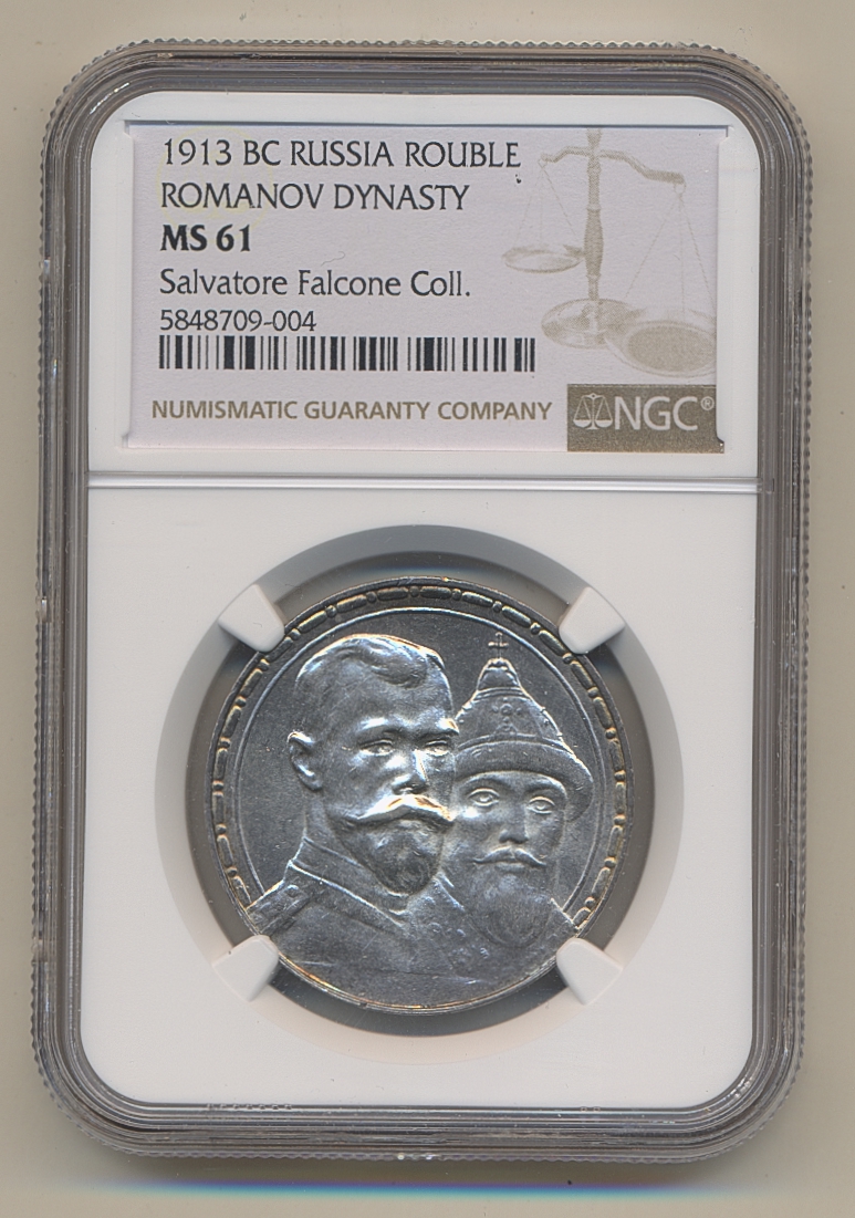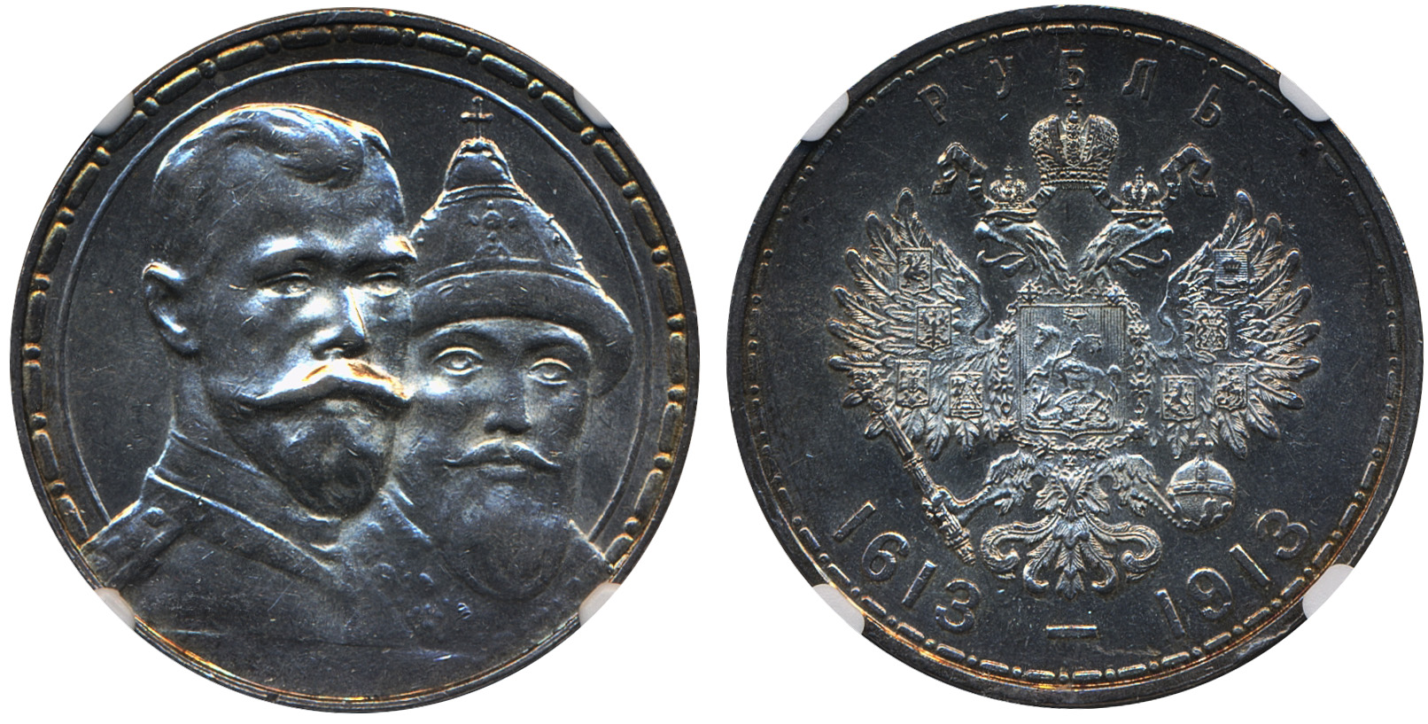 Coins, Russia. Nicholas II, Bitkin 336, 1 rouble 1913. Commemorative issue to 300th Anniversary of Romanov Dynasty. High relief variety. Graded by NGC as MS61. XF-UNC. See certification at NGC