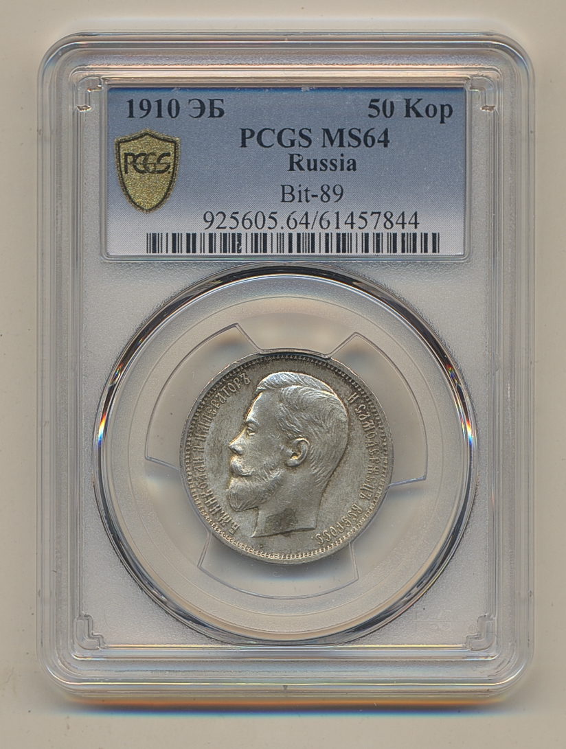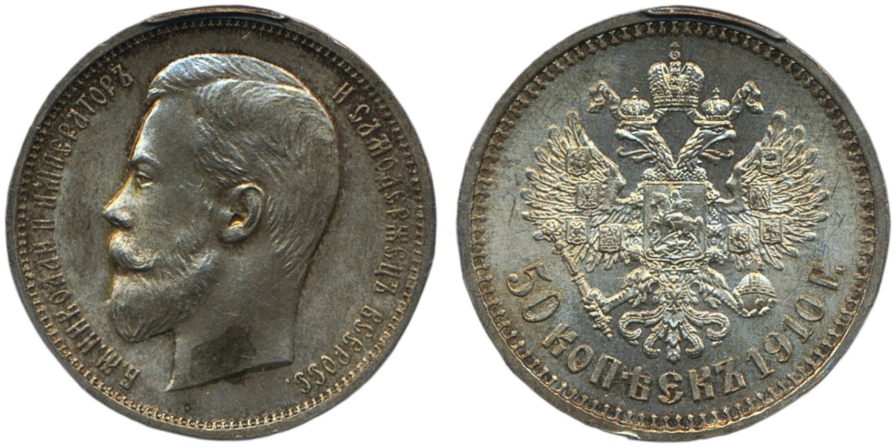 Coins, Russia. Nicholas II, Bitkin 89, 50 kopeks 1910. Beautiful lustrous example. Graded by PCGS as MS64. XF-UNC. See certification at PCGS
