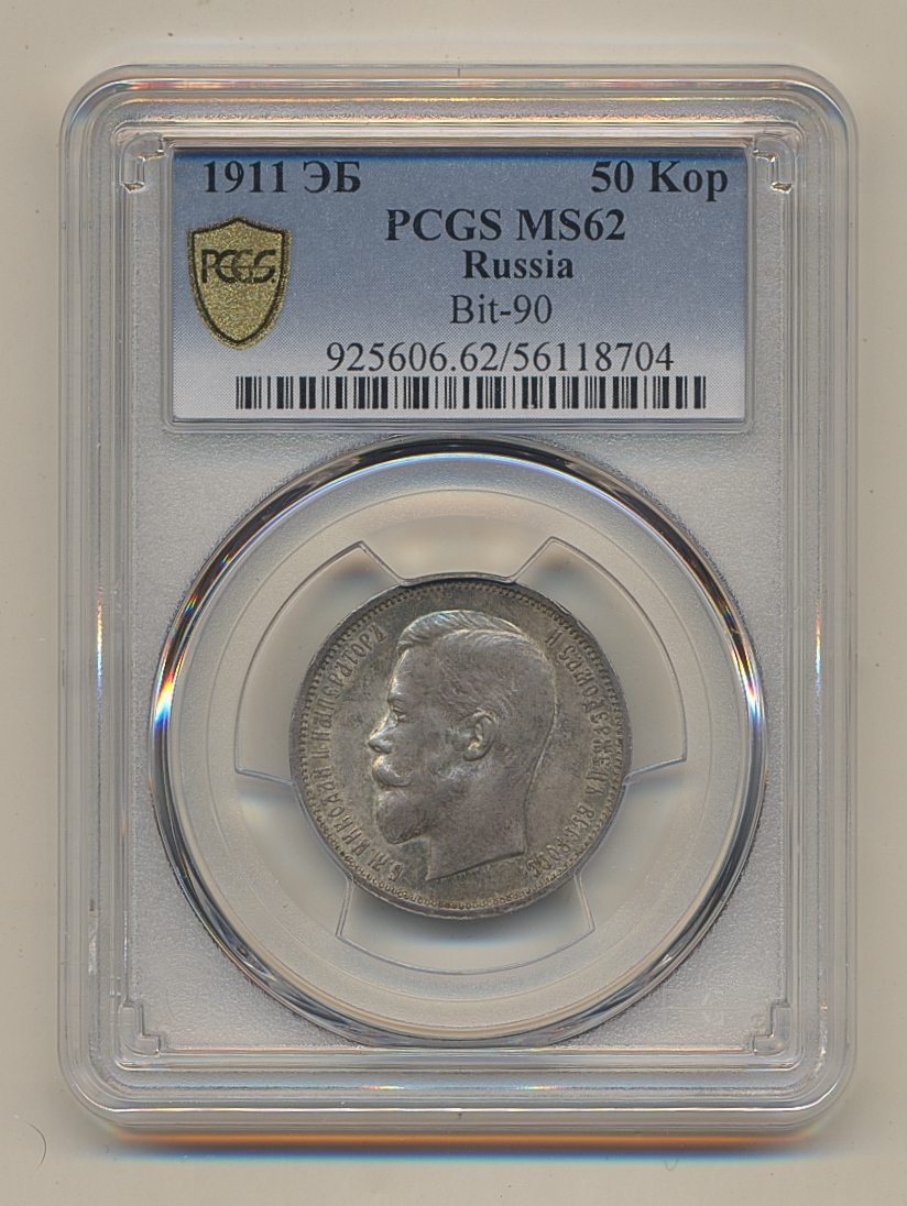 Coins, Russia. Nicholas II, Bitkin 90, 50 kopeks 1911. Graded by PCGS as MS62. XF-UNC. See certification at PCGS