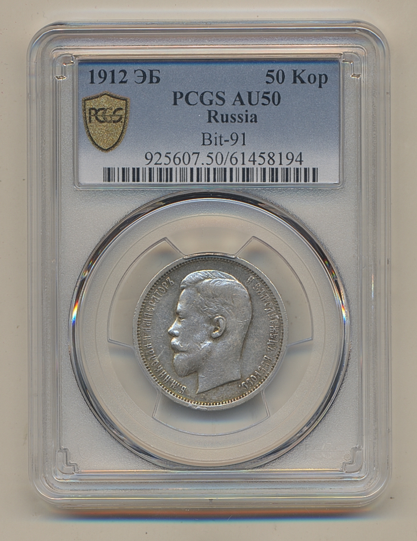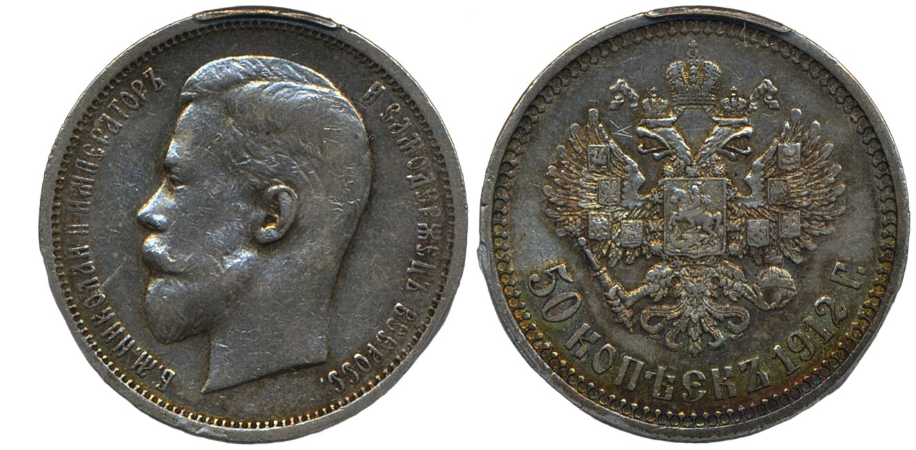 Coins, Russia. Nicholas II, Bitkin 91, 50 kopeks 1912. Graded by PCGS as AU50. XF. See certification at PCGS