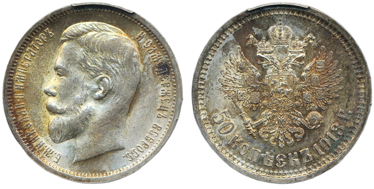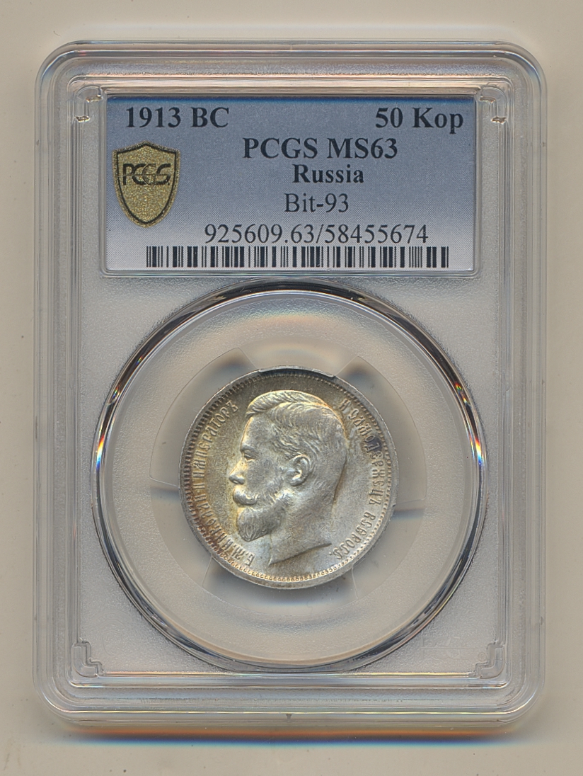 Coins, Russia. Nicholas II, Bitkin 93, 50 kopeks 1913. Beautifully toned. Graded by PCGS as MS63. XF-UNC. See certification at PCGS