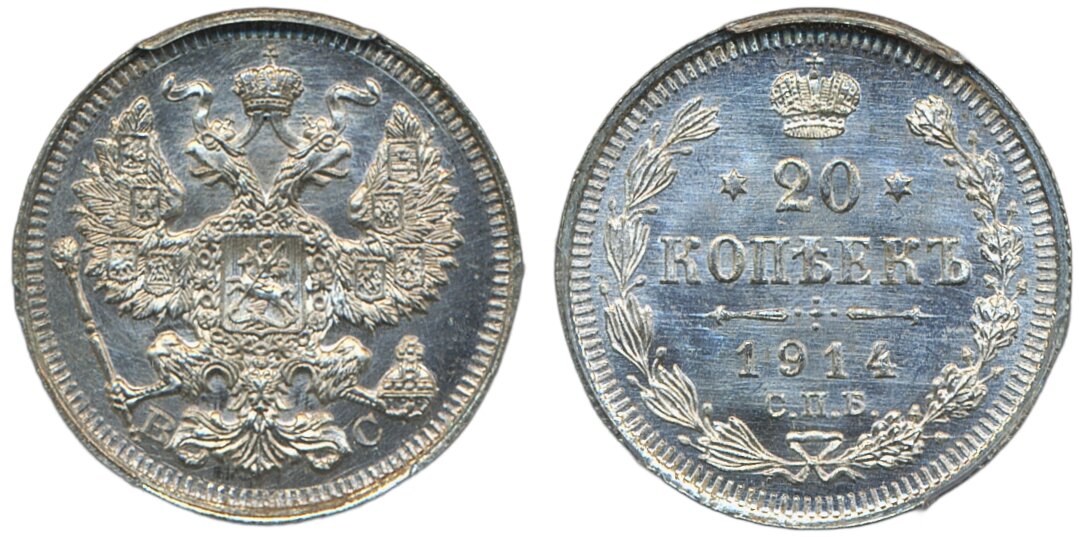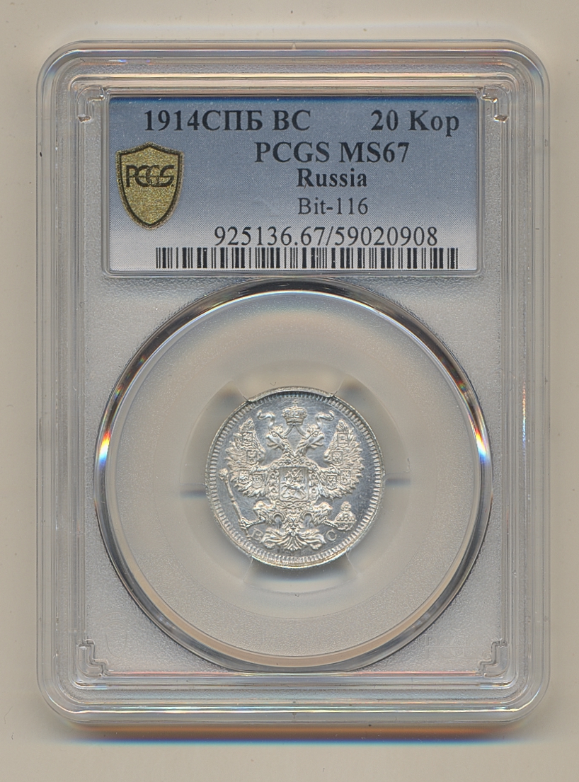 Coins, Russia. Nicholas II, Bitkin 116, 20 kopeks 1914. Graded by PCGS as MS67. UNC. See certification at PCGS