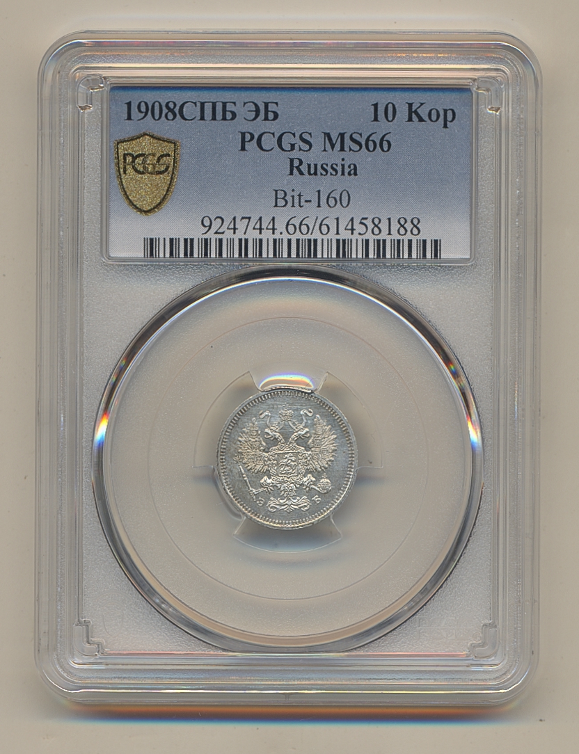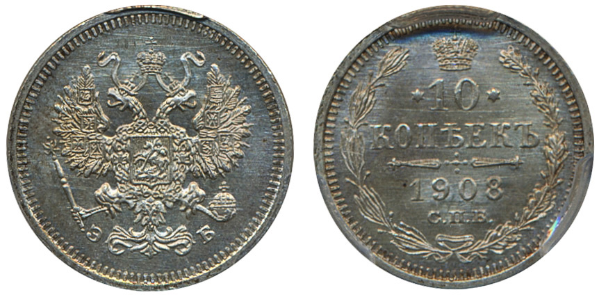 Coins, Russia. Nicholas II, Bitkin 160, 10 kopeks 1908. Graded by PCGS as MS66. UNC. See certification at PCGS