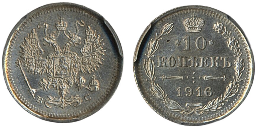 Coins, Russia. Nicholas II, Bitkin 169, 10 kopeks 1916. Graded by PCGS as MS65. UNC. See certification at PCGS
