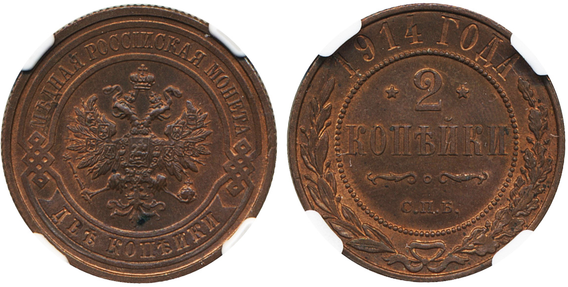 Coins, Russia. Nicholas II, Bitkin 244, 2 kopeks 1914. Graded by NGC as MS64 BN. XF-UNC. See certification at NGC
