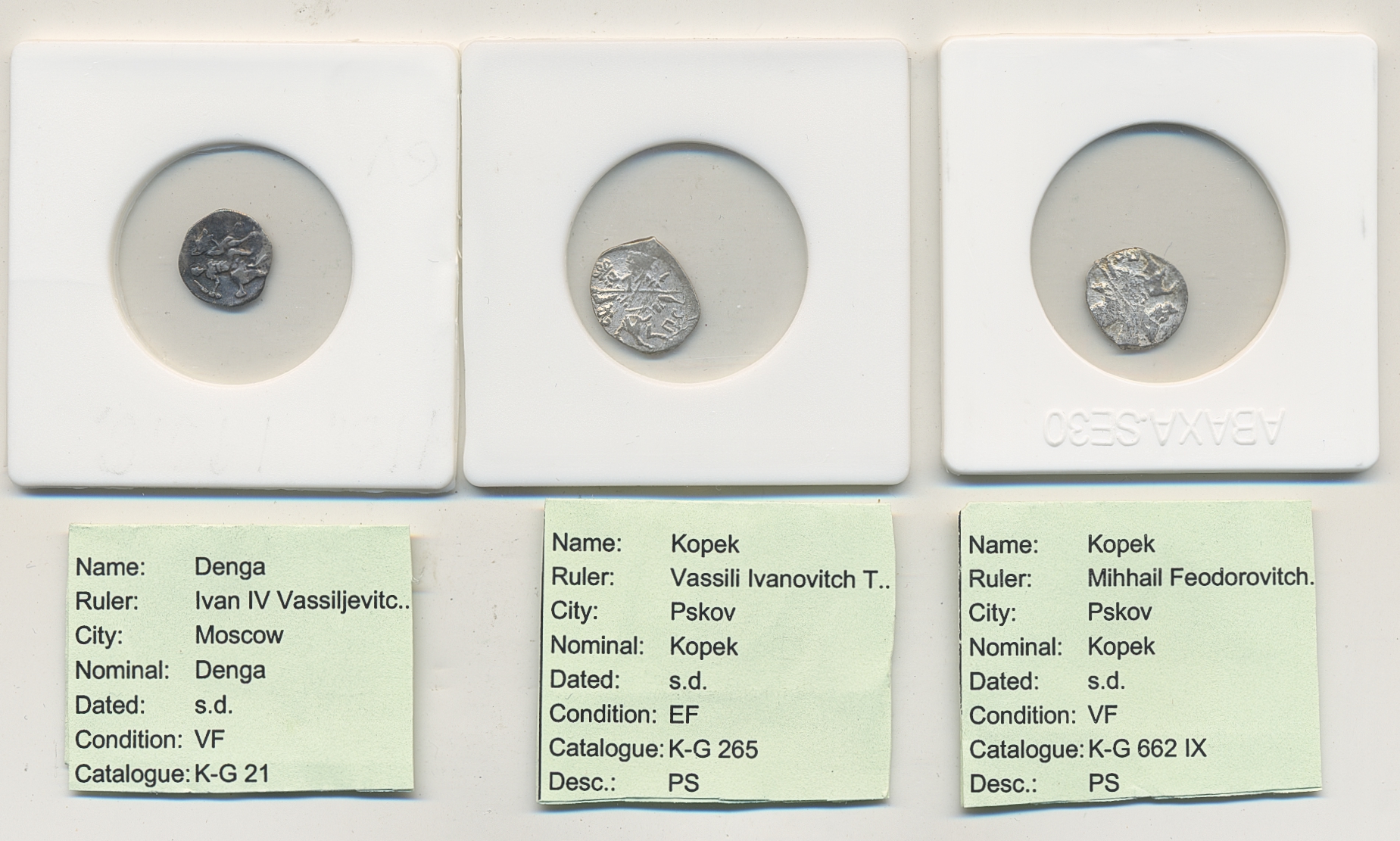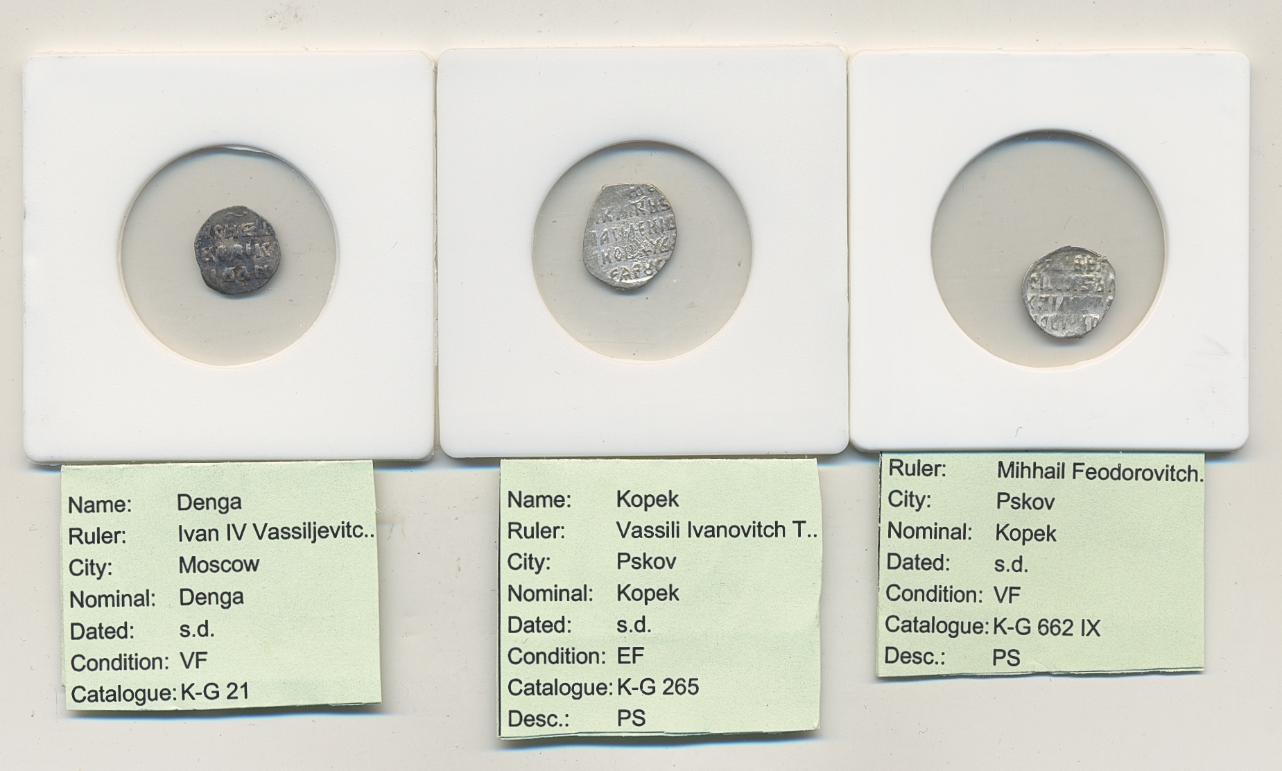 Coins, Russia. Three silver coins, one denga + two kopeks, 1500s. VF-XF.