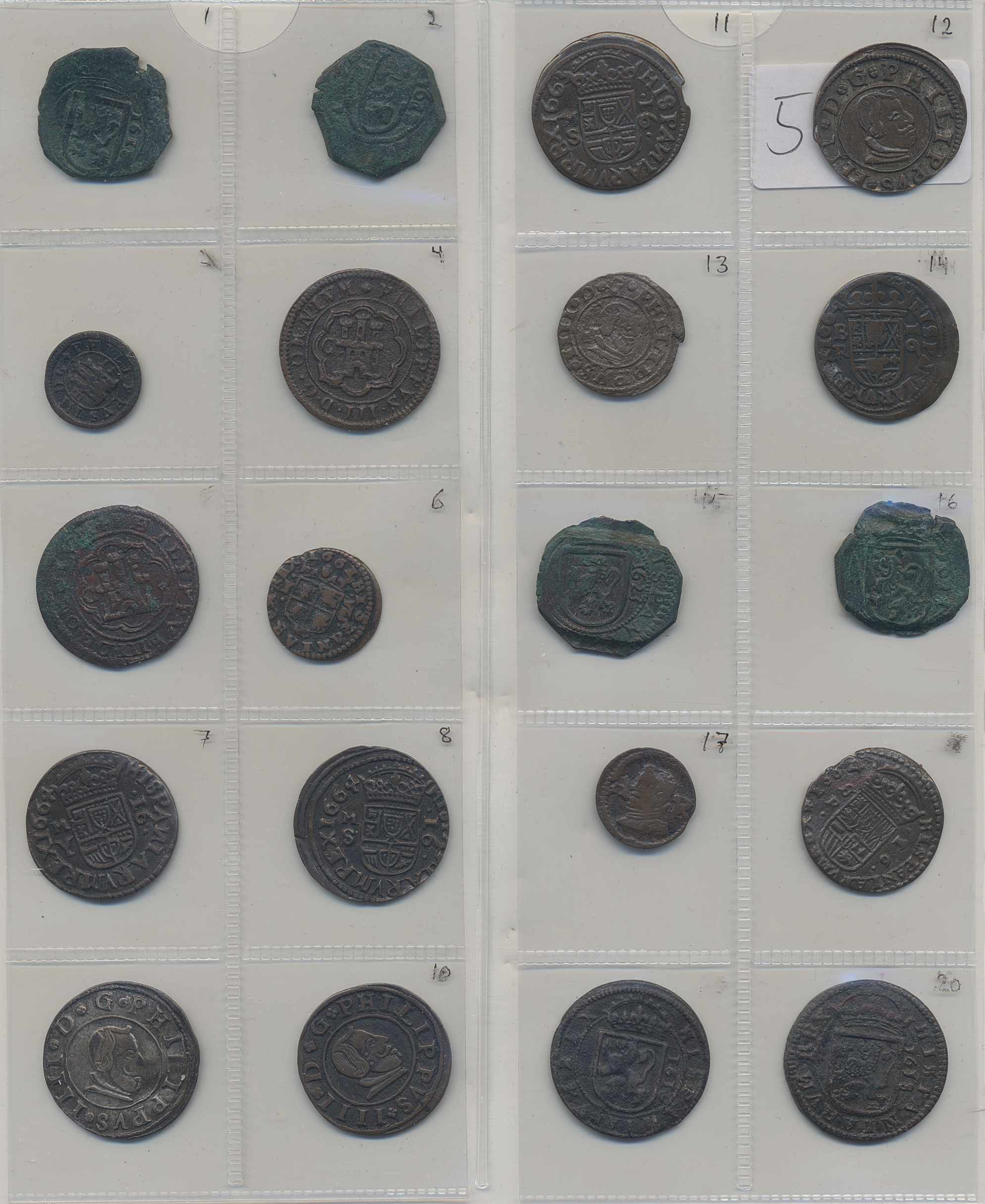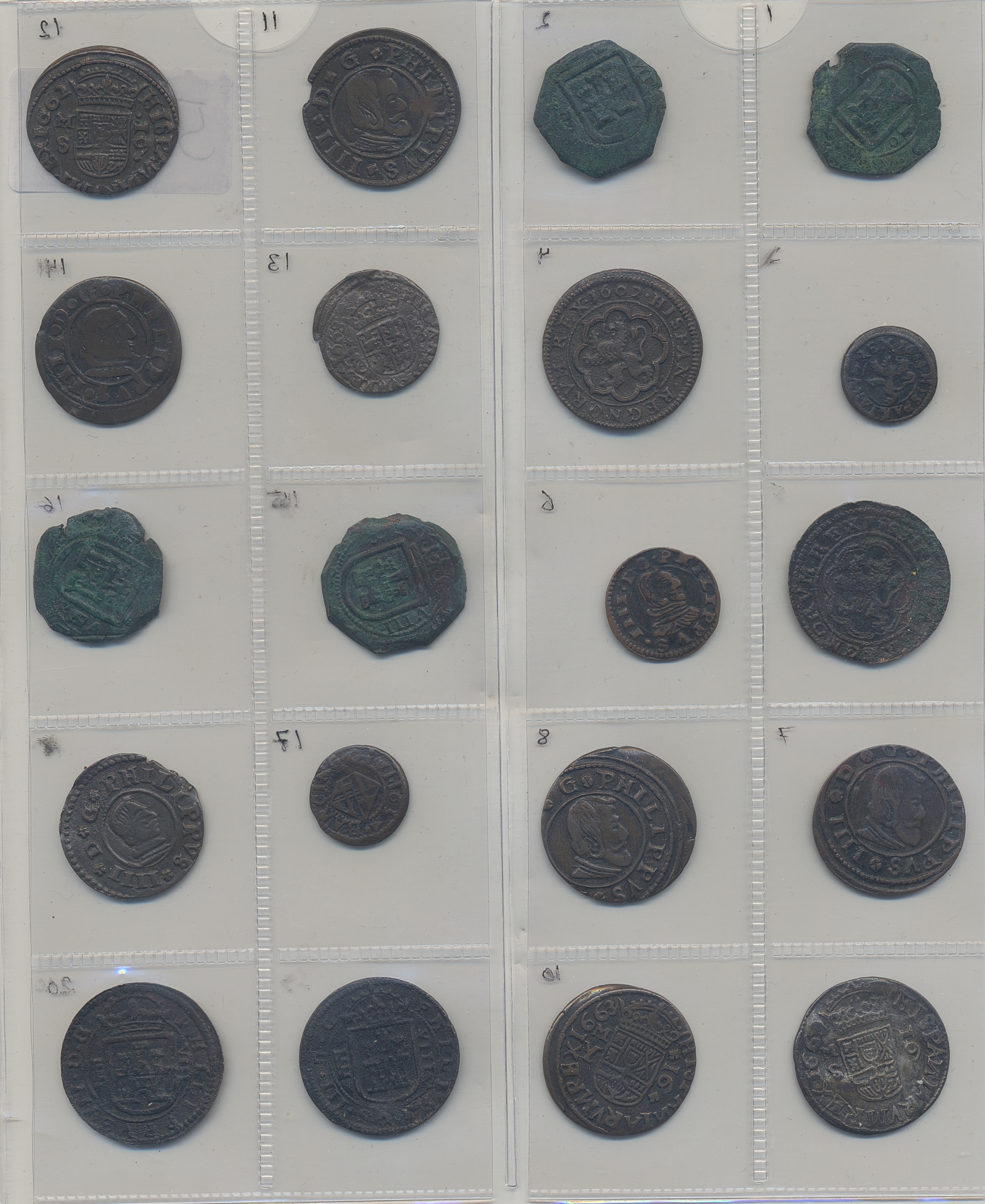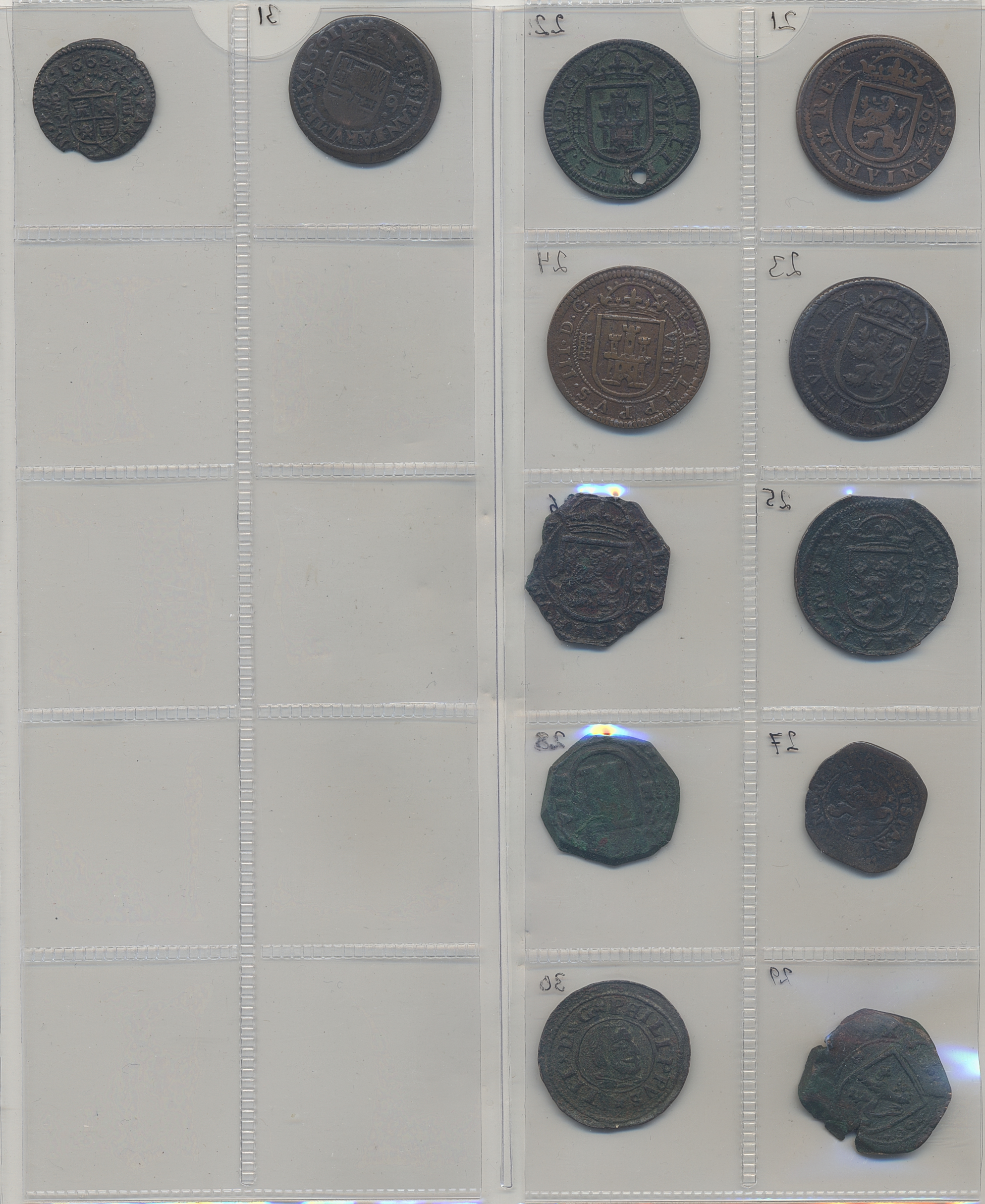 Coins, Spain. Collection of 32 copper coins in maravedis denominations. Many different dates and mints from late 1500s to 1660s. Includes envelopes identifying each coin. Several high grade examples, some with verdigris. Please inspect! F-XF.