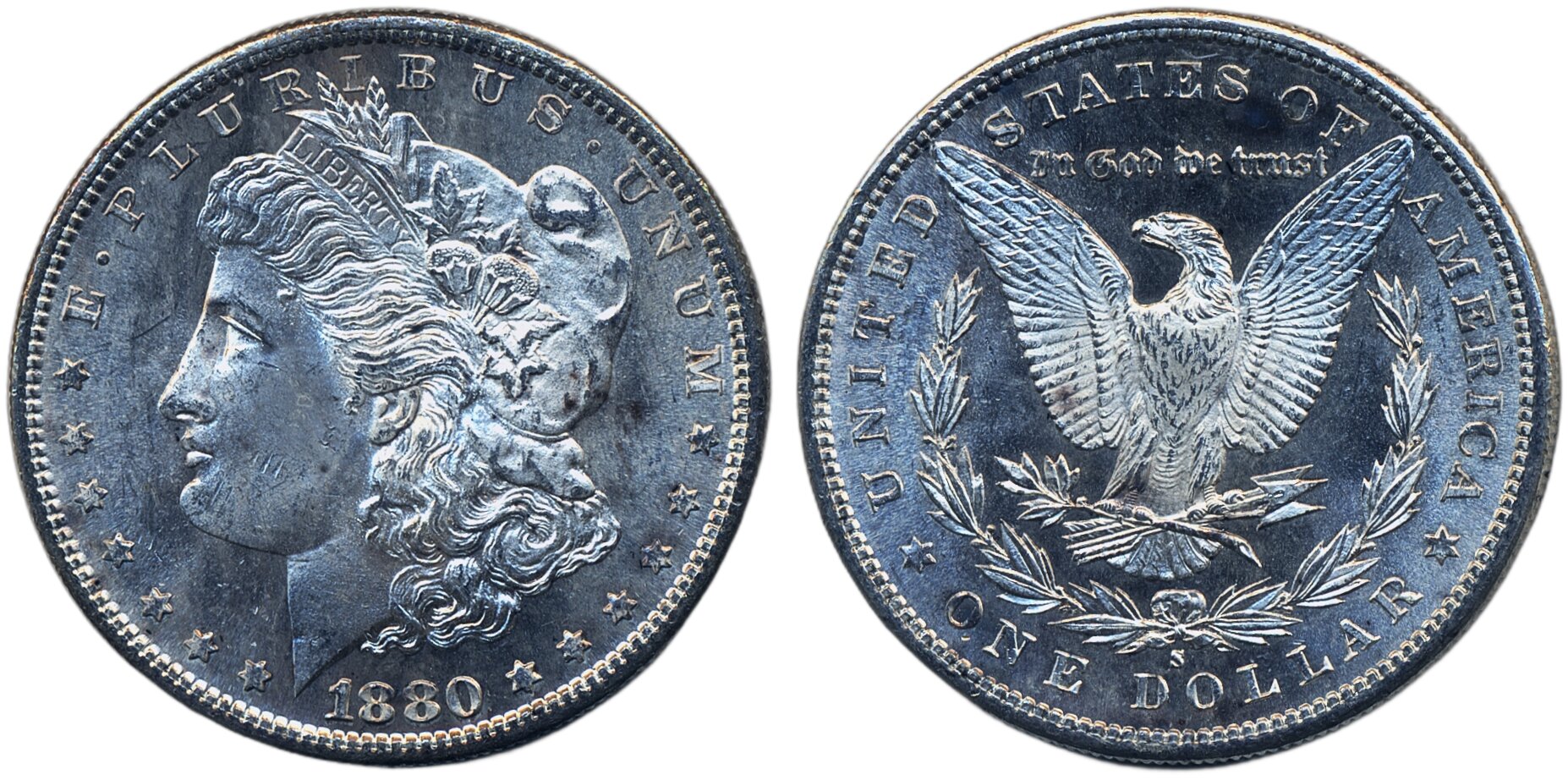 Coins, U.S.A. KM 110, 1 dollar 1880 S. Somewhat spotty patina. XF-UNC.